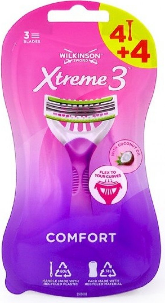 Dámská holítka **Wilkinson Sword Xtreme 3 Comfort** s **třemi flexibilními břity hladce a bez podráždění oholí všechny křivky vašeho těla**. ### Čím si vás holítka Xtreme 3 Comfort získají? * **obsahují lubrikační proužek s kokosovým olejem**, * přizpůsobí se jakémukoliv záhybu, * rukojeť vyrobená z recyklovaného plastu.