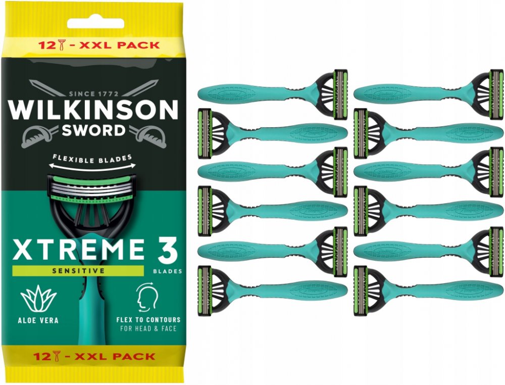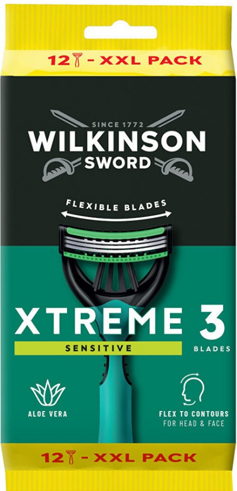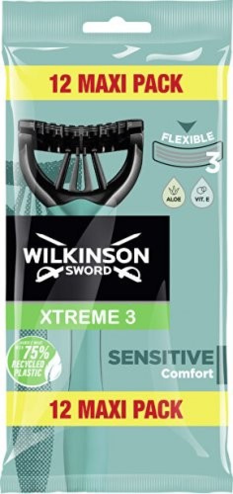 WILKINSON SWORD Sword Xtreme3 Sensitive Comfort Maxi Pack 12 ks Jednorázová holítka Wilkinson Xtreme3 Sensitive Comfort zajišťují jemné a důkladné oholení ve všech požadovaných úhlech. Zvlhčovací proužek s aloe vera a vitamínem E chrání pokožku před podrážděním a je ideální i pro citlivou pleť. Rukojeť holícího strojku je z recyklovatelného plastu.