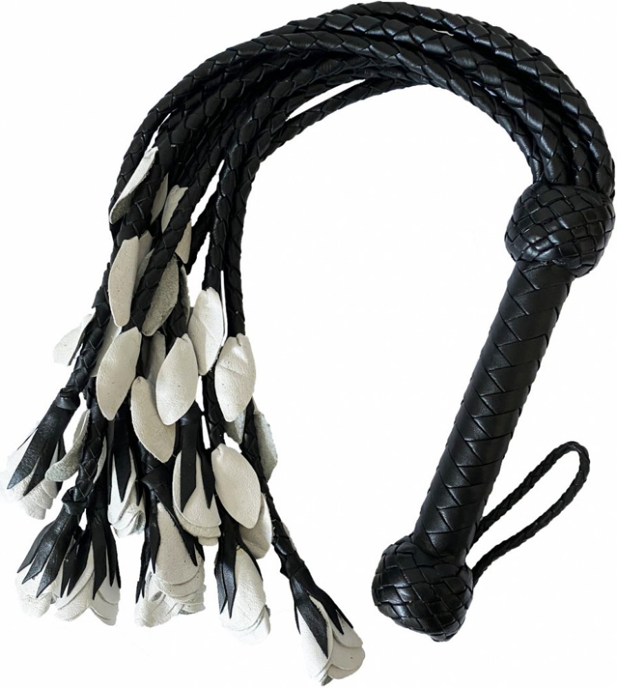 Černá důtka se špetkou nevinnosti ve tvaru květů s lístky. Kvalitní pletená důtka z pravé kůže k SM a BDSM hrám. Na konci rukojeti je poutko, které slouží k zavěšení na zápěstí nebo věšák.