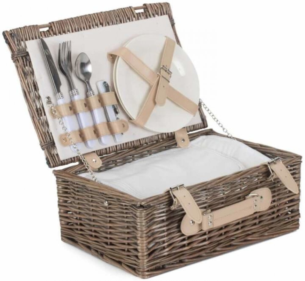 Skladný piknikový kufřík BASIC PLUS s nádobím pro dvě osoby. Piknikový koš je vyroben z kvalitní pravé vrby, proutí je ošetřeno metodou antique wash do tónů šedé barvy.