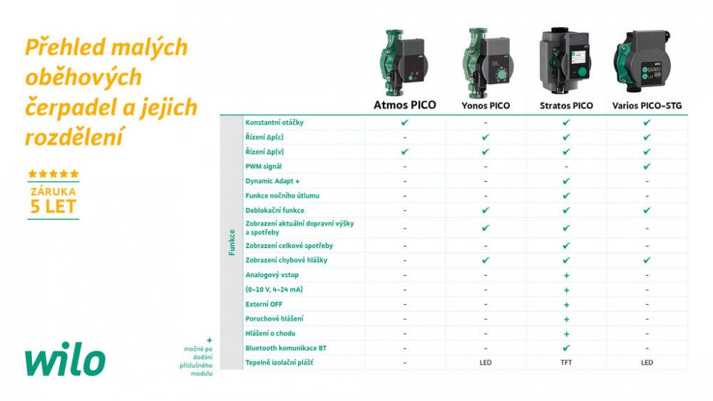 Čerpadlo s vysokou účinností Wilo-Atmos PICO, řízené elektronicky. Bezúdržbové mokroběžné oběhové čerpadlo s připojením na závit, se synchronním motorem odolným vůči zablokování podle technologie ECM a s integrovanou elektronickou regulací výkonu pro plynulou regulaci rozdílu tlaku. Použitelné pro všechna topná a klimatizační zařízení.