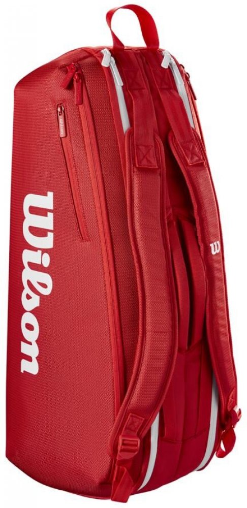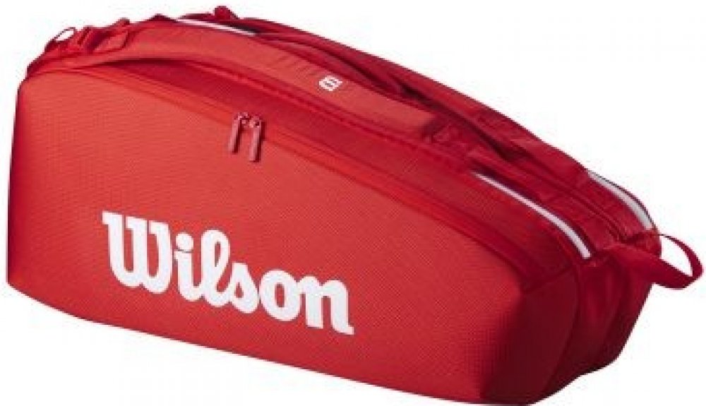 Tenisová taška WILSON Super Tour 6 pojme až šest tenisových raket ve dvou hlavních přihrádkách na tenisové vybavení, včetně jedné s výstelkou Thermoguard, která chrání před extrémními teplotami. Dále disponuje 3 bočními kapsami na příslušenství a cennosti. Je vyrobený z prémiové tkaniny. Nastavitelné ramenní popruhy pro snazší přenášení.