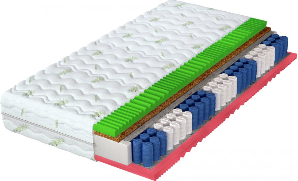 Materiálové složení: Filc, NanoHARD taštičkové pružiny, Kokosová vrstva, Polyuretanová PUR pěna T25 a T28, Potah