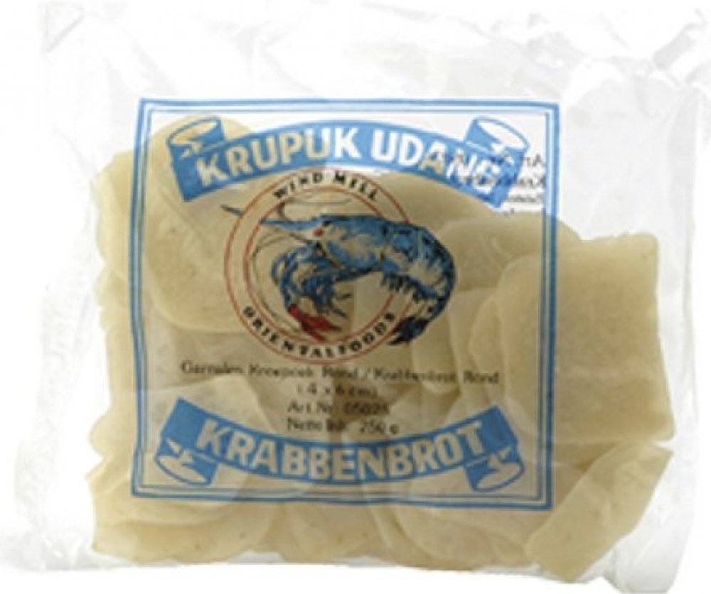 Krevetové chipsy Krupuk - Ovál jsou chutnou a zajímavou alternativou k běžným chipsům. Nabízejí jedinečnou chuť moře a křupavou texturu. Jsou ideální jako pochoutka k filmu, při oslavách nebo jako doplněk k asijským pokrmům. Díky své historii a původu představují kousek asijské kultury, který si můžete vychutnat v pohodlí domova. Návod k použitíNa pánvi rozehřejte olej na 180°C a vložte do něj pár chipsů. Jakmile se krevetové chipsy zvětší a začnou plavat, tak je rychle vyndejte z pánve a papírovým ubrouskem osušte přebytečný tuk.Složenítapioková mouka, krevety, cukr, pšeničná mouka, vejce sůlAlergielepek, laktóza, pšenice