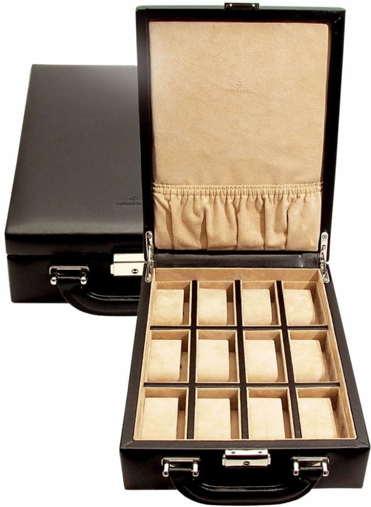 Kazeta pro přehledné uložení až 12-ti hodinek nebo náramků, vyrobená ze dřeva potaženého kvalitní pravou kůží. Vnitřek šperkovnice je lemován italským sametem. Každé okýnko kazety je vybaveno flexibilním polštářkem pro uložení hodinek nebo náramků. Ve víku je kapsička na drobné šperky nebo manžetové knoflíčky. Víko je možné uzamknout vysoce kvalitním pružinovým zámkem.