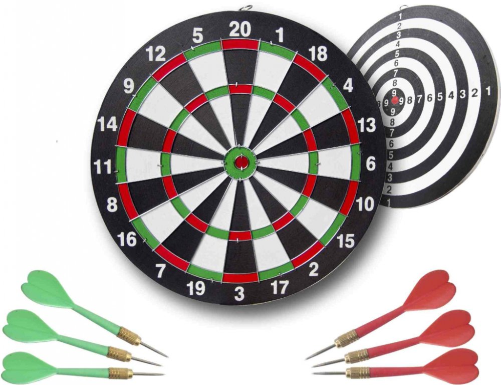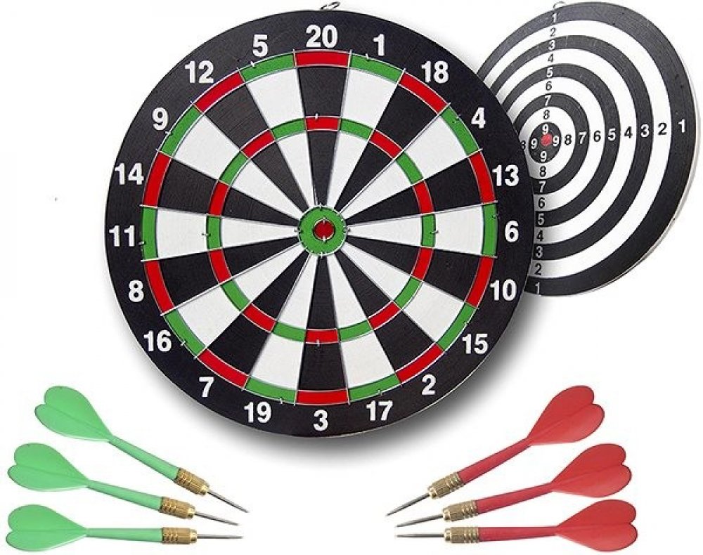 Oboustranný papírový terč pro šipky s ostrými kovovými hroty.