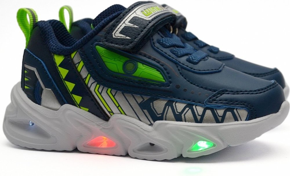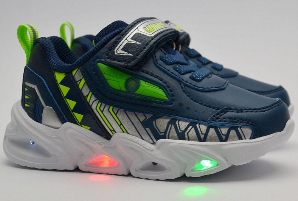 Chlapecké vycházkové boty, které na boku blikají LED světýlka. Velmi lehké, s ohebnou phylonovou podešví, prodyšná, s pevným opatkem. Vyjímatelná textilní měkká stélka. Zapínaní na suchý zip. Na baterku uvnitř obuvi se nevztahuje dvouletá záruka, není vyměnitelná.