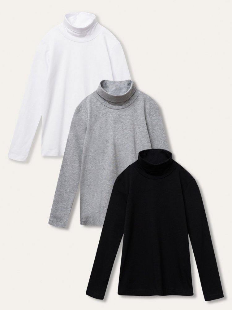 Set 3ks roláků s dlouhým rukávem v barvách černá, bílá a šedý melanž, které se hodí ke každému oblečení. Můžete použít samostatně nebo jako spodní vrstvu v chladných dnech. Vhodné pro dívky i pro chlapce. Velikosti: 98 - 170 cm.