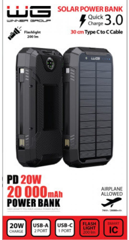 Solární powerbanka PD20W 20000 mAh QC 3.0Naše Solární powerbanka PD20W 20000 mAh QC 3.0 je dokonalým společníkem pro ty, kteří jsou často v pohybu a potřebují spolehlivý zdroj energie pro svá zařízení. S funkcí rychlého nabíjení a solárním panelem nabízí tato powerbanka flexibilitu a výkonnost ve vašem každodenním životě.Vysoká kapacita baterie: S kapacitou 20000 mAh poskytuje dostatek energie pro několik nabití vašich zařízení. Není takto problém nabíjet i čtyři zařízení najednou. Rychlé nabíjení PD20W a QC 3.0: Podpora rychlého nabíjení PD20W a technologie Quick Charge 3.0 umožňují rychlé a efektivní nabíjení.Solární nabíjení: Solární panel umožňuje dobíjení powerbanky pomocí sluneční energie, ideální pro outdoorové aktivity nebo nouzové situace.Dual USB výstupy: Dva USB výstupy umožňují současné nabíjení dvou zařízení současně, což je praktické pro delší výlety nebo sdílení s přáteli.Kromě těchto dvou výstupů powerbanka má ještě Type-C a bezdrátové nabíjení.Naopak vstupy jsou tyto: Micro, Type-C a solární nabíjení.Bezpečné a spolehlivé použití: Vestavěná ochrana proti přepětí, přehřátí a zkratu zajišťuje bezpečný provoz a prodlužuje životnost vašich zařízení.Součástí powerbanky jsou také kabely, a to:USB-A - TypeC (11,5cm)USB-A - Lightning (11,5cm) - tyto dva malé krásně zapadají do těla powerbanky, takže se nemusíte bát, že je zapomenete.Type-C - Type-C (30cm)Aby toho nebylo málo a opravdu jste se přesvědčili, že tohle je nepostradatelný kousek do Vaší výbavy, je powerbanka vybavena také kompasem a led světlem, což Vám zajistí být vždy na tom správném místě i po tmě. Led světlo se aktivuje po zmáčknutí bočního tlačítka.Získejte svou spolehlivou záložní baterii s naší Solární powerbankou PD20W 20000 mAh QC 3.0. Objednejte si ji ještě dnes a buďte připraveni na všechny vaše dobrodružství!