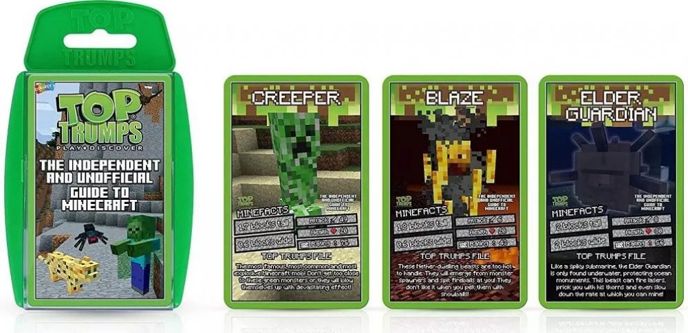 Top Trumps Minecraft - zábavná vzdělávací karetní společenská hra pro všechny, kteří milují Minecraft. Připravte se přechytračit své protivníky, objevujte nová a vzrušující fakta a bojujte.