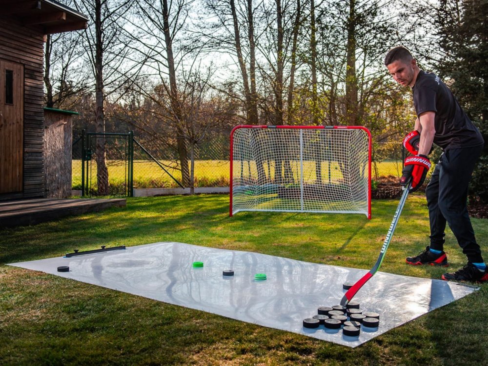 Desky Winnwell Shooting Pad jsou vyrobeny ze směsi speciálních polymerů, které jsou obsahem umělého ledu. Kluznost desky je srovnatelná s klasickým ledem. Můžete tak bez obav trénovat střelbu s klasickým hokejovým pukem. Extrémně rychlé jsou na plochách Winnwell tréninkové puky Green Biscuit. Pokud tedy chcete trénovat techniku s holí, stickhandling doporučujeme vyzkoušet tuto kombinaci. Jaká je životnost desek? Jsou téměř nezničitelné. Při běžném zacházení (deska bude sloužit k tréninku střelby nebo jiných hokejových dovedností) vydrží opravdu hodně. Opotřebení a škrábance, se kterými se musí počítat však nijak neovlivňují výborné vlastnosti desek, nebo jejich kluznost. Škrábance a drobné rýhy navíc umocňují vlastnosti klasického ledu, který také není 100% hladký. Jak se ale říká, všeho moc škodí! Pokud máte na desce drobný štěrk nebo ostré kamínky vždy je dobré desku omést a očistit. Je potřeba nějaká speciální údržba? Není! Na desky se nepoužívají žádné speciální přípravky, nebo leštiče. Pokud je deska špinavá, stačí ji zamést, nebo utřít vlhkým hadrem, nechat oschnout a můžete znovu začít trénovat.