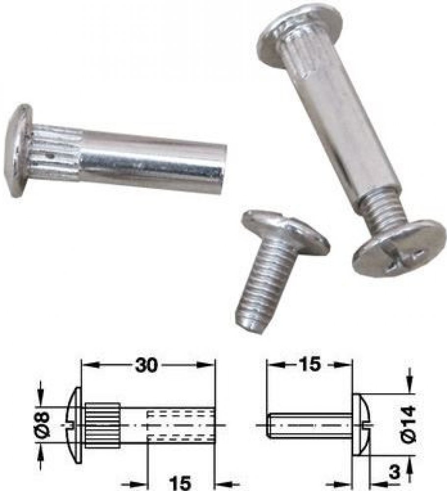 šroub ke spojení dvou bočnic skříněk, délka je na dva materiály o síle 18mm (celkem 36mm), jsou-li desky silnější, lze část kování s vnějším metrickým závite...