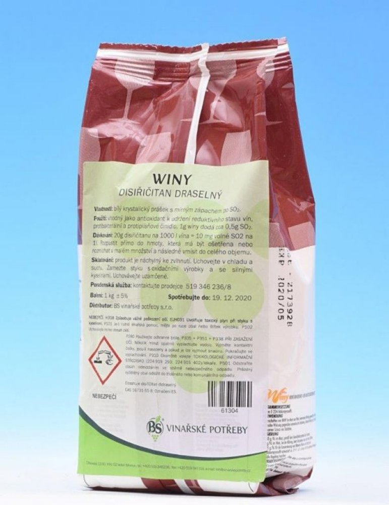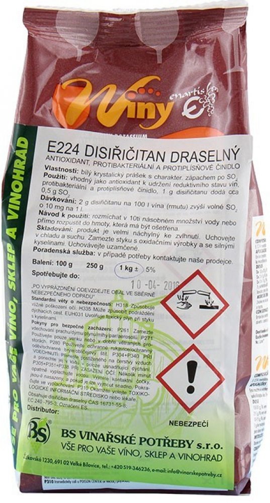 DISIŘIČITAN DRASELNÝ Bílý krystalický prášek s mírným zápachem po oxidu siřičitém. Vhodný jako antioxidant k udržení reduktivního stavu vín, protibakteriální a protiplísňové činidlo. 1g disiřičitanu dodá 0.5g SO2.