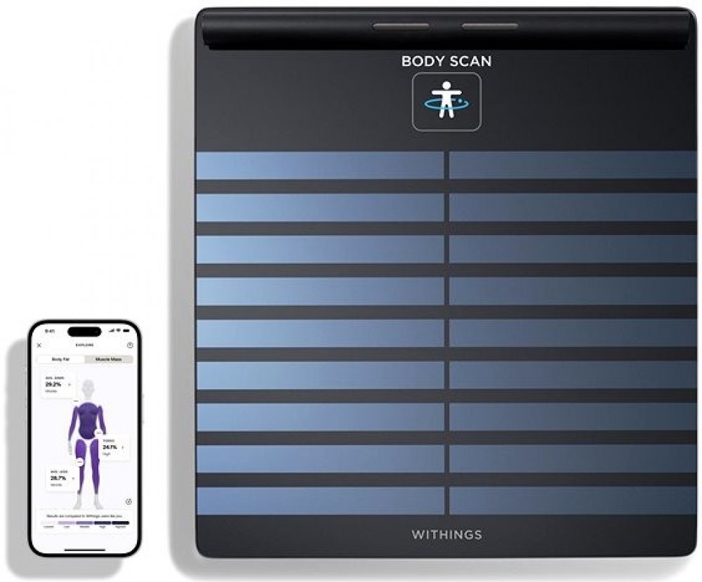 Osobní váha - diagnostická, sledování aktivity, spánku, váhy. Analýza složení celého těla. Měří s přesností na 50g. Využívá Bluetooth, Wi-fi. Přehledný displej. Měření EKG. Sleduje až 8 uživatelů. Rozměry: 327 x 327 x 18 mm.