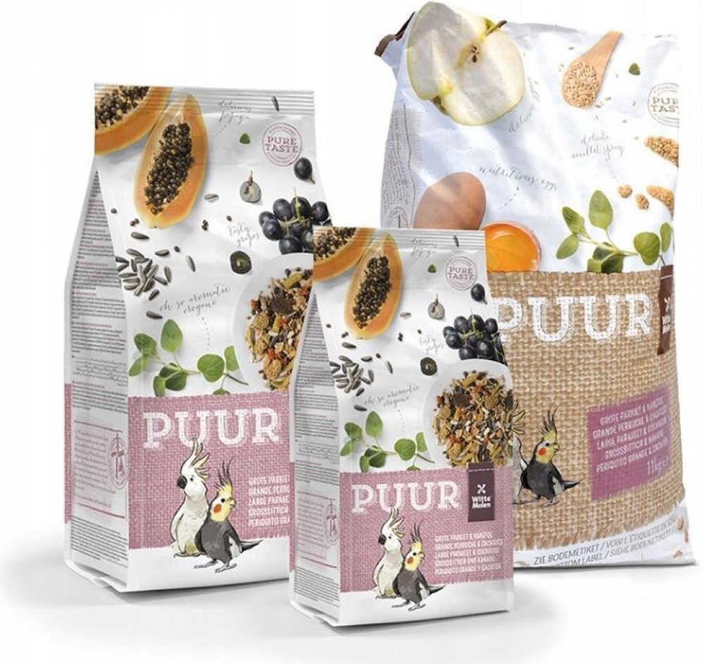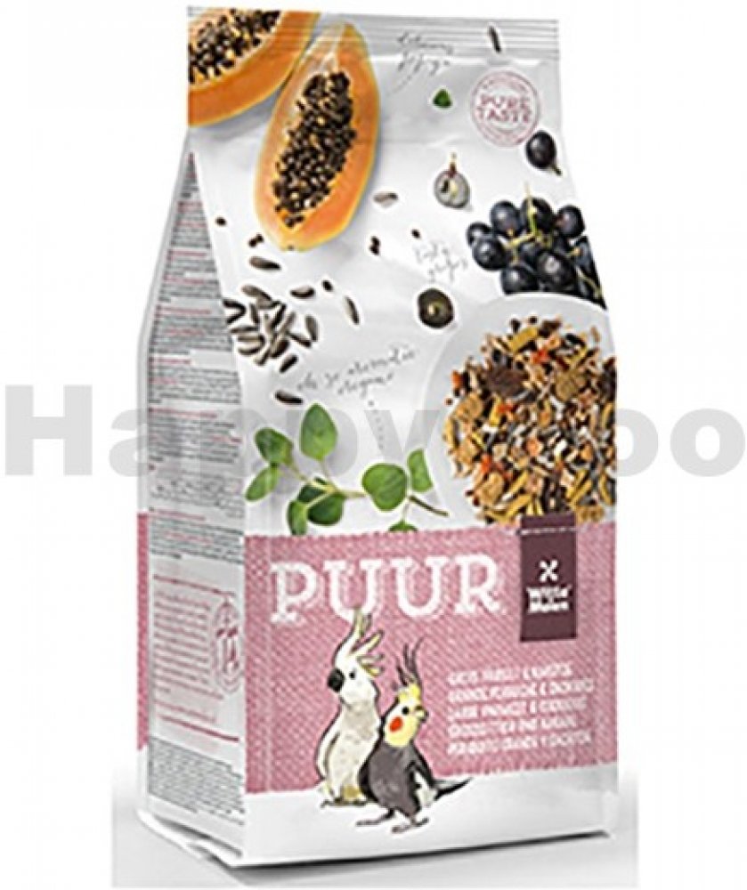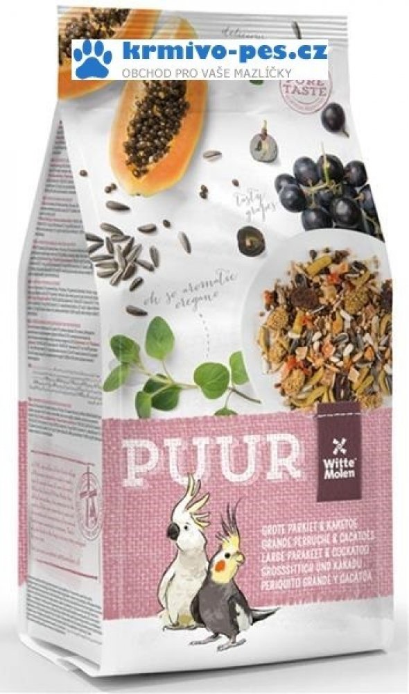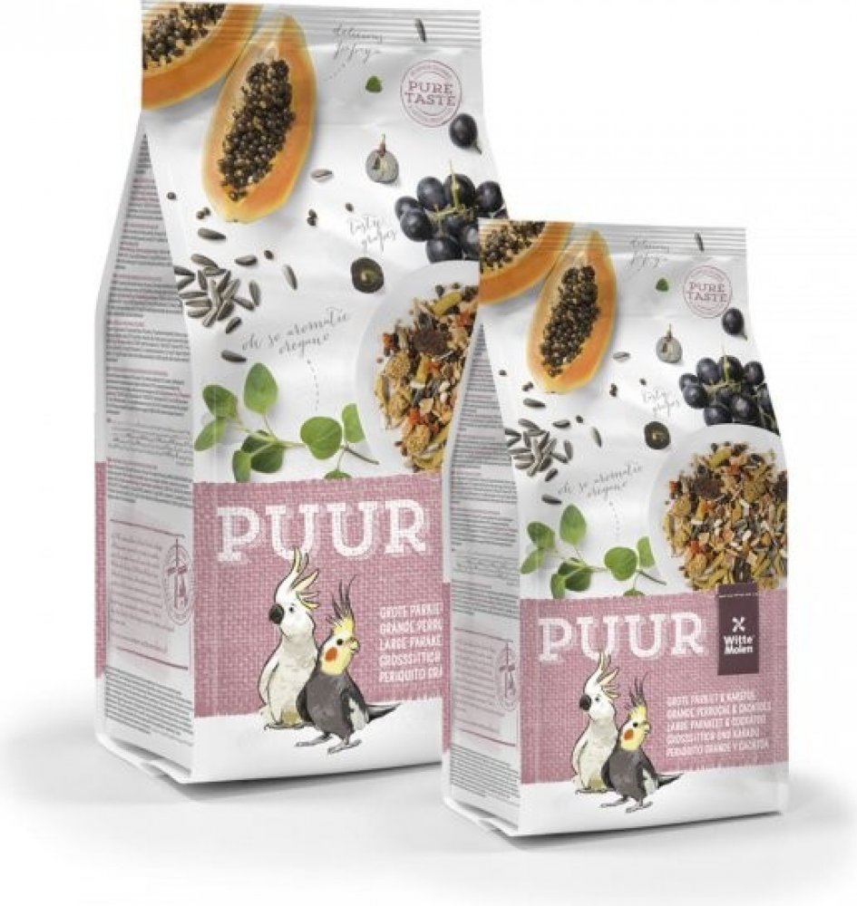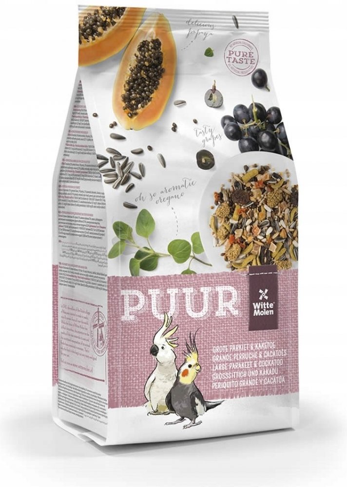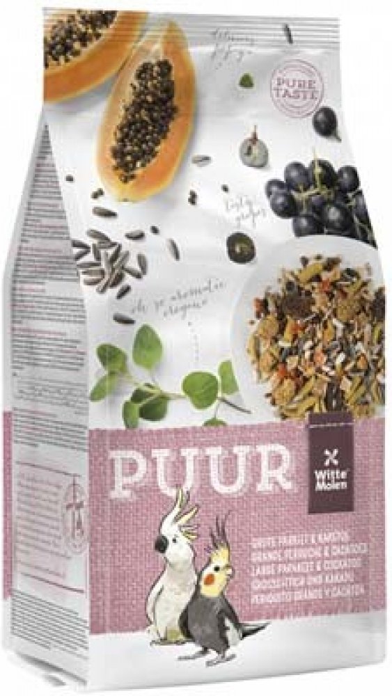 Receptura PUUR Large Parakeet & Cockatoo – střední papoušci obsahuje vše, co střední papoušci (korely, rozely,…) a kakaduové potřebují pro plnohodnotný život. Vyvážené složení s přidanými vitamíny a stopovými prvky pro zvýšení vitality ptáků. Přidané bílkoviny (vejce) napomáhají skvělé kondici opeření a odchovu mláďat. Lněné semínko pro lesklé peří a snadné přepeřování. Přidaná prebiotika se podílejí na zdravém trávení. Navíc drcené lastury ústřic podporují zdravé trávení a jsou výborným zdrojem vápníku. Krmivo bez umělých barviv a umělých aromat – chutí a vůní.