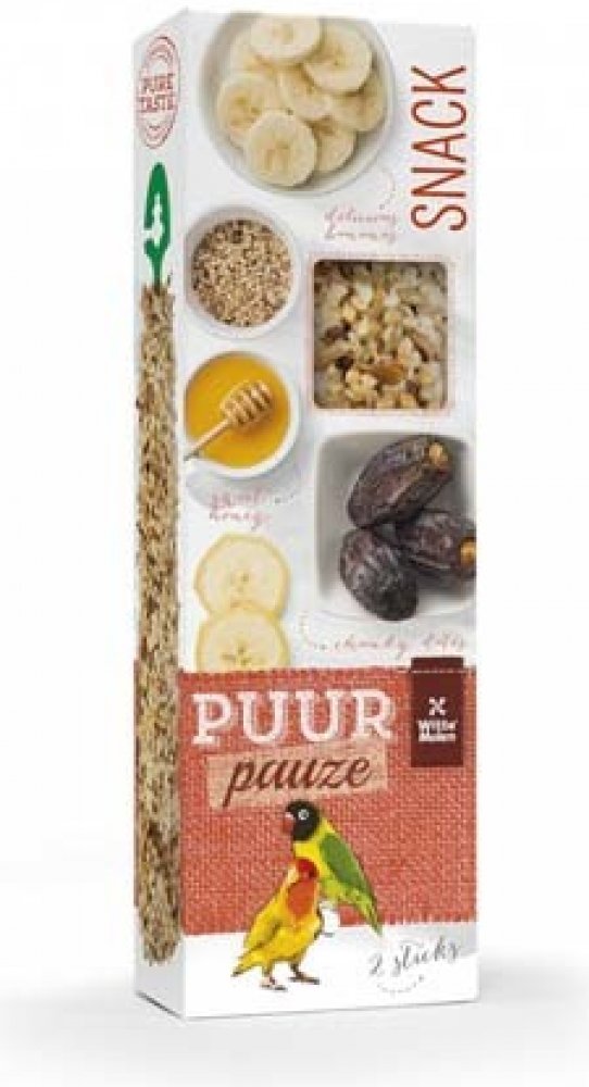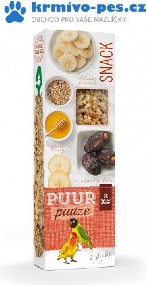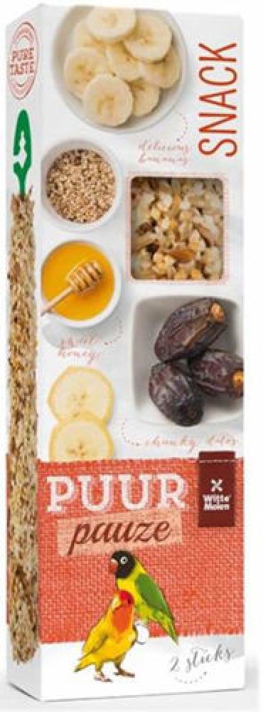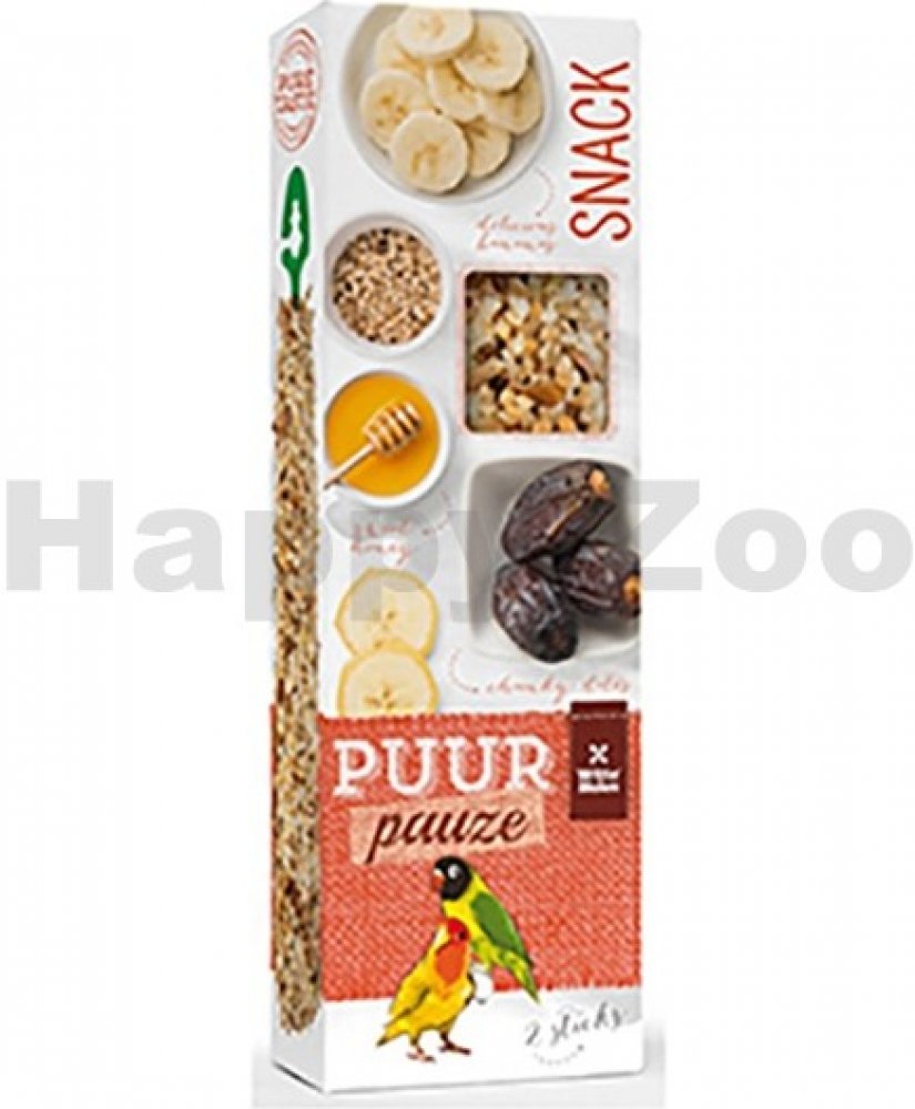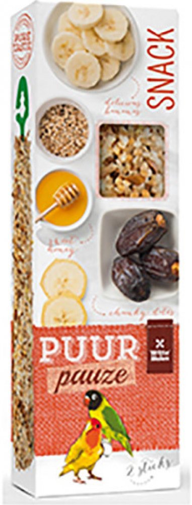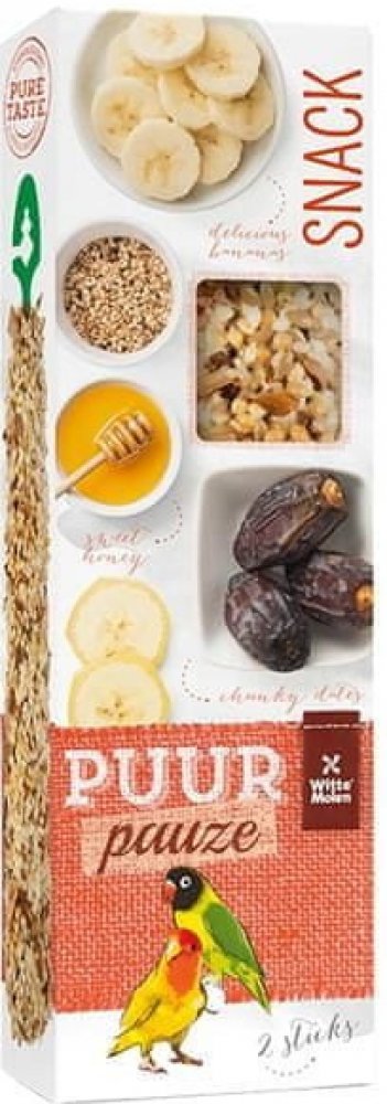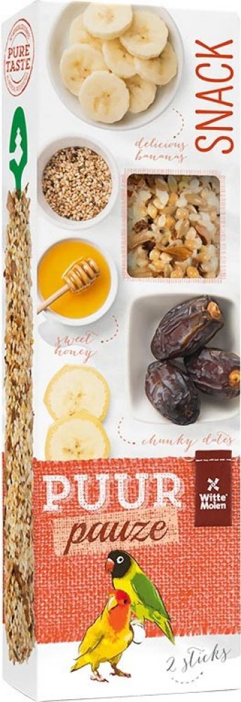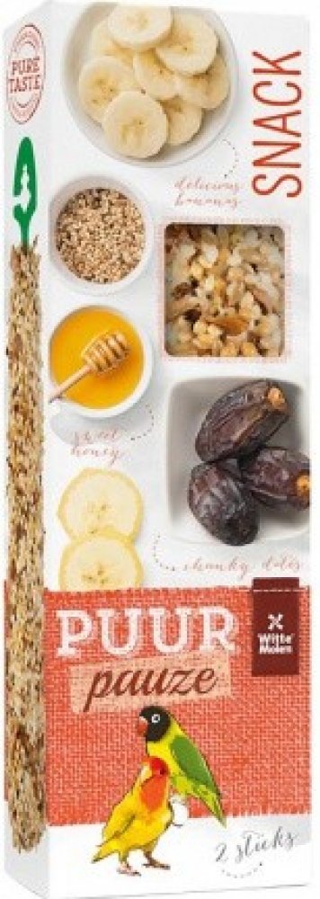 Lahodné tyčinky pro agapornise s datlemi, banány, medem a sezamovými semínky PUUR pauze Seed Sticks jsou lahodné tyčinky pro agapornise plné přírodních chutných složek pro skutečný gurmánský požitek. Křupavé tyčinky podnítí aktivitu ptáků, zabaví je a zaženou nudu.