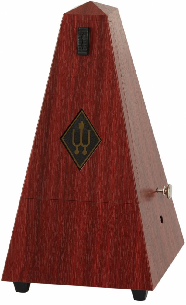 Mechanický metronom Wittner v klasickém provedení ve tvaru pyramidy. Plastový kryt zhotovený jako imitace pravého dřeva.