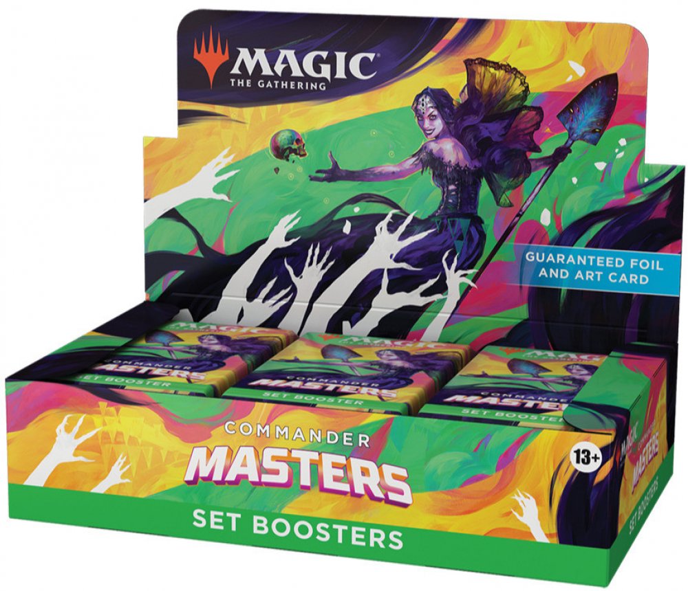 Commander Masters Set Booster Box obsahuje 24 Commander Masters Set Boosterů. Každý Set Booster obsahuje 15 karet Magicu, 1 Art kartu a 1 token/reklamní kartu nebo kartu z "The List" (speciální karta z historie Magicu - nachází se ve 25 % packů), včetně 2-6 karet vzácnosti Rare nebo vyšší (2: 34 %; 3: 48 %; 4: 15 %; 5: 2 %; 6: