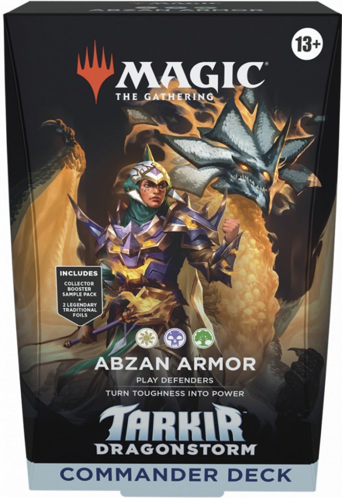 Předpřipravený balíček Magic: The Gathering - Tarkir: Dragonstorm Commander Deck - Abzan Armor obsahuje 100 karet připravené rovnou ke hře. V edici Tarkir: Dragonstorm vyšlo celkem 5 těchto předpřipravených balíčků. Součástí balení je balíček 100 Magic karet, krabička na karty, 10 token karet, referenční karta, Collector booster sample pack o dvou kartách a 2 legendární foilové karty.