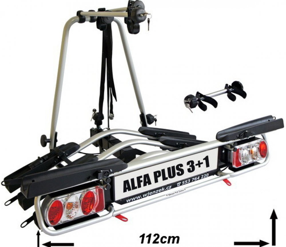 Výhody modelu ALFA plus:1. Transport kol s delšími rámy (elektrokola, kola s 29“).2. Zabezpečení větší ochrany kol při transportu.3. Mnohem větší komfort a rychlost upínaní kol umožňují větší šířka nosiče o 60 mm a většírozteč mezi koly o 15 mm.5. Korekce rovinnosti nosiče na tažném zařízení (nosič nevisí dozadu) díky zakomponovánípomocného stavěcího šroubu.6. Gumové jistící pásky zabraňující samovolnému sklopení