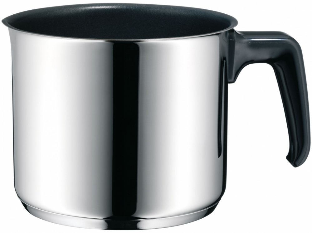 na mléko, průměr 14 cm, výška 12 cm, objem 1,7l, pro ohřívání mléka, horké čokolády a míchání pudinků, dlouhá rukojeť vyčnívající do strany nebo směřující dolů, materiál nerezová ocel Cromargan 18/10 s třívrstvým nepřilnavým povrchem uvnitř, kompatibilní typ ohřevu indukce, plyn, sklokeramika, elektřina, lze mýt v myčce (0797819041)