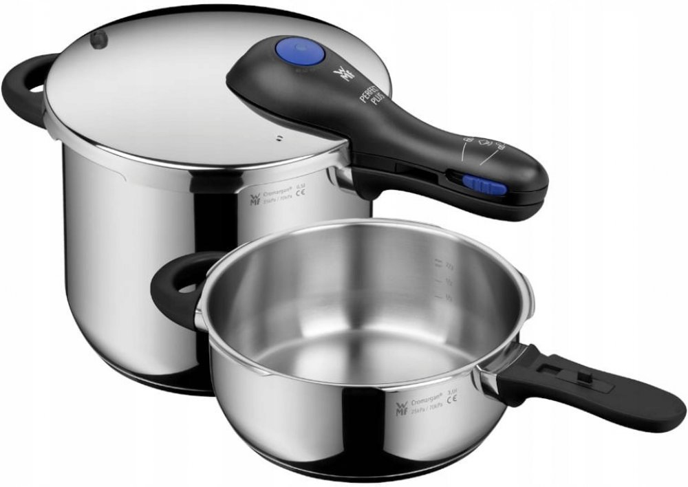 Sada 2 tlakových hrnců z kolekce Perfect Plus uznávané německé značky WMF o objemu 3 a 6,5 litru. Umožňuje rychle připravit jakékoliv jídlo, od polévek a gulášů až po vaření zeleniny nebo masa. Rychlovarné konvice jsou vyrobeny z vysoce kvalitní nerezové oceli a lze je mýt v myčce nádobí