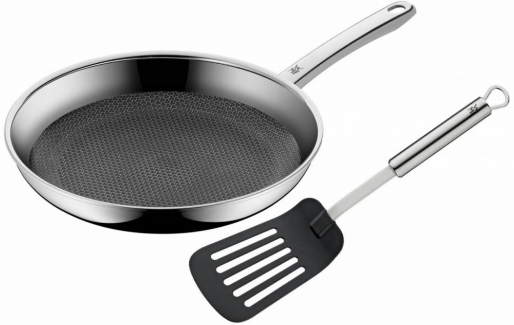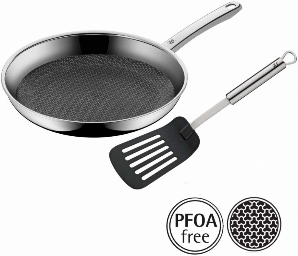 Obsah: 1x pánev 28 cm s povrchovou úpravou - ideální pro varné desky s Ø 22 cm, 1x špachtle (délka 32,2 cm) - číslo položky: 1756289990Materiál: vícevrstvý materiál (nerezová ocel Cromargan, hliníkové jádro, vnější strana chromovaná ocel). PTFE nepřilnavý povlak s voštinovou strukturou z nerezové oceli odolnou proti poškrábání. Žáruvzdorný a odolný proti pečení v troubě až do 260 °CPánev lze používat na všech standardních typech varných desek: Indukční, plynové, elektrické, sklokeramické. Konstrukce dna (TransTherm) zajišťuje rovnoměrné rozložení tepla a dlouhé udržení teplaNepřilnavý povrch je chráněn zvýšenou strukturou z nerezové oceli. Viditelné voštiny umožňují nepřilnavé smažení s ideálním rozložením tuku při vysokých teplotách Vaše zákonná záruční práva zůstávají nedotčenaŘada WMF Profi Resist kombinuje dobré vlastnosti pánve z nerezové oceli s vlastnostmi modelu s nepřilnavým povrchem: hliníkové jádro, nerezová ocel uvnitř a extrémně odolná chromovaná ocel zvenku. Povrch s povrchovou úpravou navíc zajišťuje, že se nic tak rychle nepřipálí. Zvyšte teplotu až na maximum Nerezová ocel vydrží vysoké teploty a drůbež a další kusy masa získají lahodnou kůrčičku. Pánve Profi Resist jsou zkrátka ideální pro cokoli, co chcete rychle a horké opéct. Svištěte dál. Pánev vám bude dělat radost po dlouhou dobu, protože vyvýšená voštinová struktura z nerezové oceli chrání nepřilnavý povrch modelů Profi Resist. Pánve z vícevrstvého materiálu rovnoměrně rozvádějí teplo a jsou vhodné pro všechny typy varných desek, včetně energeticky úsporných indukčních. Krásně navržená kolekce zahrnuje vysoce kvalitní pánve a servírovací pánve i pánev wok.Ať už jste amatérský nebo profesionální kuchař, ať už připravujete smažená vajíčka se slaninou nebo vysokou kuchyni: klasická pánev na smažení, pánev s tyčinkou, nesmí chybět v žádné kuchyni. Řada pánví WMF nabízí vhodný model pro každý pokrm, každou surovinu a každý typ přípravy. Vybírejte mezi vysoce kvalitní nerezovou ocelí, hliníkem nebo vícevrstvým materiálem, mezi žáruvzdorným keramickým povrchem a odolným nepřilnavým povrchem PermaDur, mezi různými velikostmi, různými tvary a výškami okrajů a odpovídajícími poklicemi pánví. Všechny pánve s rukojetí jsou vybaveny ergonomickou rukojetí, takže se pohodlně a hladce drží v ruce. Udělejte z toho něco: pusťte se do toho a nenechte nic připálit.První nepřilnavá pánev na celý život. Díky zvýšené konstrukci z nerezové oceli je nepřilnavý povrch chráněn. Díky tomu je povrch pánve odolný proti poškrábání, pevný a trvanlivý po celý život. Pánev ProfiResist tak spojuje výhody pánve z nerezové oceli s výhodami nepřilnavé pánve a splňuje dobré požadavky na šťavnatý smažený steak i na vše, co se smaží při vysokých teplotách. Pro přesný výsledek smažení. Ať už jde o smažení při velmi vysokých teplotách nebo přípravu jemných pokrmů s malým množstvím tuku: Pánev s rukojetí Profi Resist o průměru 28 cm od WMF v sobě spojuje to nejlepší z obou světů. Zajišťuje to jedinečná kombinace vícevrstvé struktury s hliníkovým jádrem, nerezovou ocelí uvnitř a extrémně odolnou chromovanou ocelí zvenku, jakož i vynikající nepřilnavý povrch PermaDur, který je navíc chráněn speciální vyvýšenou voštinovou strukturou z odolného Cromarganu®. To znamená, že pánev Profi Resist je nejen odolná proti poškrábání a mimořádně žáruvzdorná, ale také že se na ní nic nepřipaluje, a protože tuk může být pod pokrmem optimálně rozložen, není rovnoměrný a přesný výsledek smažení výjimkou, ale pravidlem. Pánev s rukojetí Profi Resist je vhodná pro použití na jakémkoli sporáku a samozřejmě také v troubě a dodává se s kvalitní špachtlí, kterou lze mýt v myčce na nádobí a která se dá bezpečně a snadno používat i s nepřilnavými pánvemi a je ideální pro obracení choulostivých pokrmů. Ať už jde o amatérského nebo profesionálního kuchaře, ať už jde o smažená vajíčka se slaninou, nebo o vysokou kuchyni: klasika mezi pánvemi, pánev s rukojetí, by neměla chybět v žádné kuchyni. Řada pánví WMF nabízí vhodný model pro každý pokrm, ingredienci a způsob přípravy. Vybírejte mezi vysoce kvalitní nerezovou ocelí, hliníkem nebo vícevrstvým materiálem, mezi žáruvzdorným keramickým těsněním a dlouhotrvajícím nepřilnavým povrchem PermaDur, mezi různými velikostmi, různými tvary a výškami okrajů a odpovídajícími poklicemi pánví. Všechny pánve s rukojetí jsou vybaveny ergonomickou rukojetí, takže dobře a hladce padnou do ruky. Udělejte z toho něco: pusťte se do toho - a nenechte nic připálit. První nepřilnavá pánev s extrémně dlouhou životností. Voštinová struktura chrání nepřilnavý povrch před pořezáním a poškrábáním. Dno pánve je navíc vyrobeno z vícevrstvého materiálu, který zajišťuje optimální rozložení tepla. Vlastnosti: Pánev je vhodná pro přípravu pokrmů, které se používají v kuchyni:Těsnění s voštinovou strukturouvčetně stěrky Profi PlusNejlepší nepřilnavé vlastnostiUvnitřCromargan® Nerezová ocel 18/10Vnější strana z chromované oceliHliníkové jádroVhodné do myčky nádobívhodné pro indukci