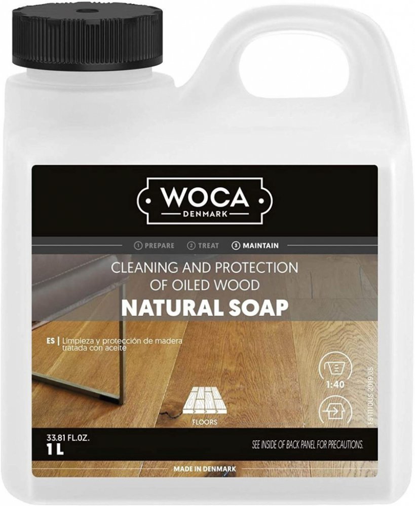 - Před použitím Natural Soap (Mýdla na olejované podlahy) můžete velmi špinavé podlahy očistit Intensive Wood Cleaner (Intenzivním čističem) WOCA.