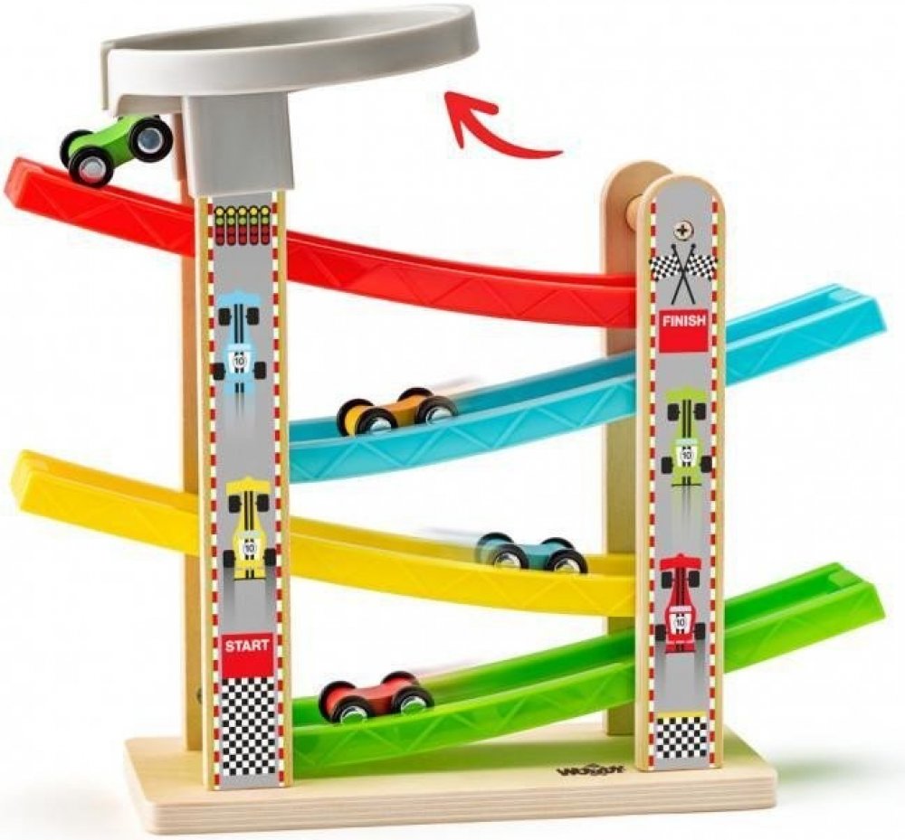 Hračka pro nejmenší. Dítě umístí autíčka na horní plochu dráhy, naklopí ji a autíčka sjedou po dráze dolů. Rozvoj jemné motoriky a koordinace oko-ruka. Autodráha se čtyřmi barevnými autíčky, které díky překlopení snadno zdolávají kaskádu barevných silniček. Postavte autíčko na nejvyšší část autodráhy a sledujte co udělá! Zábavná hračka nejen pro kluky, kterou si děti zamilují. Česká značka WOODY -...