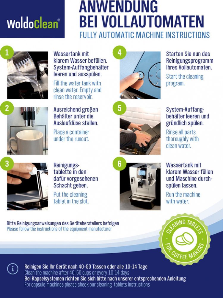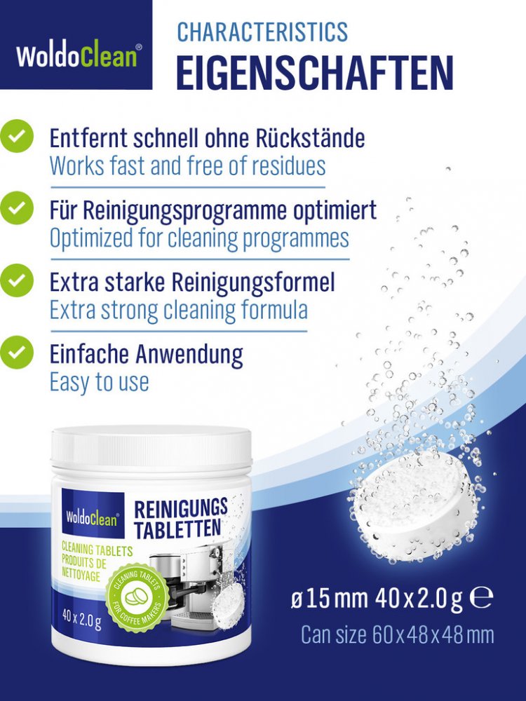 Kávová zrna obsahují zejména kávové vosky a oleje, které mohou kávovar ucpat. Aby nedošlo k usazování usazenin, je důležitá pravidelná péče o kávovar. Čisticí tableta lze vložit do drážky nebo do prostoru pro prášek. Tablety o hmotnosti 2 g a o průměru 15 mm odstraňují nečistoty a chrání části stroje.