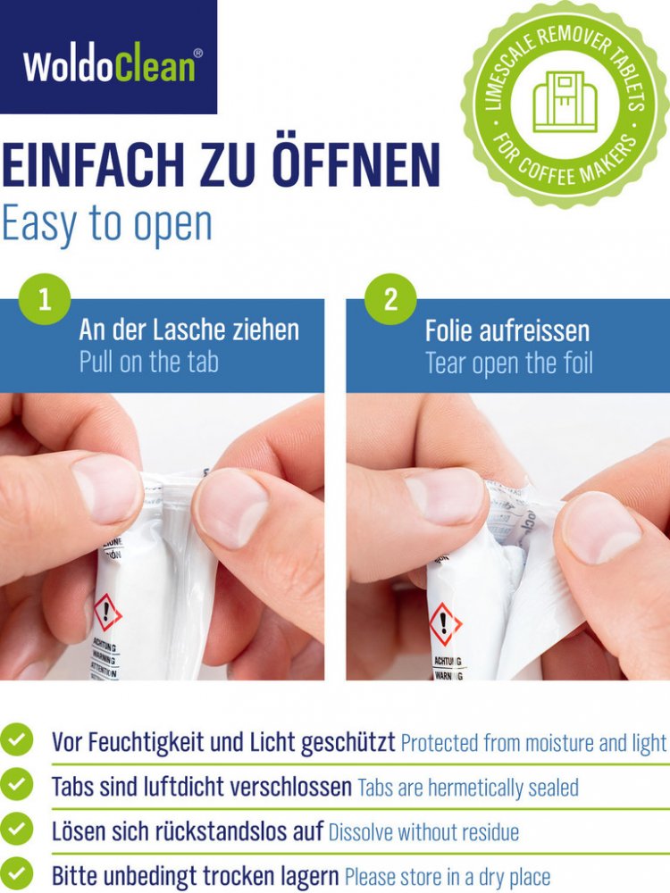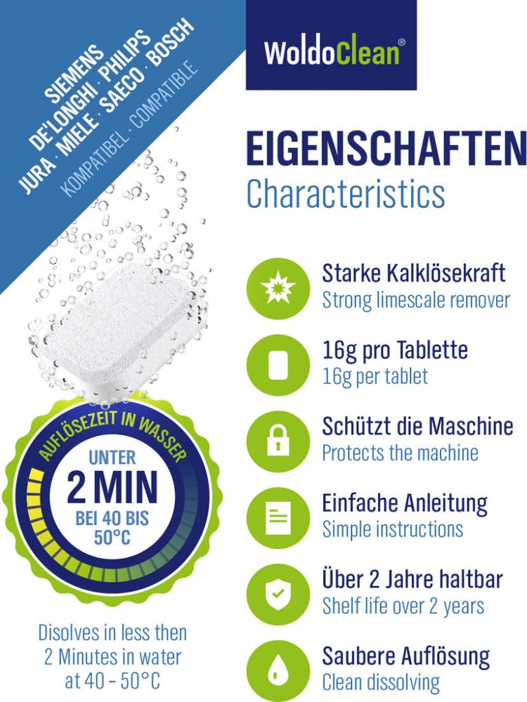 Odvápňovací tablety pro kávové stroje a plně automatické kávovary, které jsou také kompatibilní se stroji Delonghi, Siemens, Jura, Nespresso, Seaco, Dolce Gusto a Tassimo. Levné odvápňovací tablety jako alternativa k drahým originálním tabletám výrobce. Čistící tablety odstraňují usazeniny z vápence a udržuje plně funkční automatický stroj. Odvápňovací tablety jsou vhodné také pro domácnost, kancelář a catering. Také espreso přístroje a kávovary na kapsle nebo pákové kávovary mohou být snadno odvápněny.