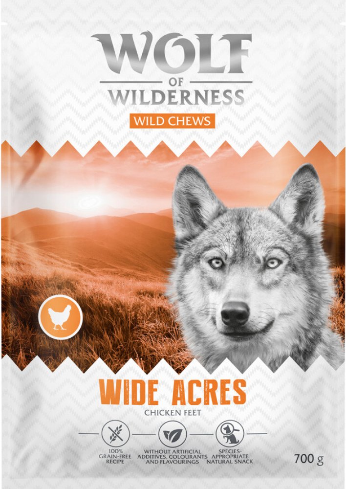 Wolf of Wilderness kuřecí pařáty "Wide Acres": Vytvořeno podle stravovacích návyků vlků v divočině: pro psy všech plemen a velikostí 100 % bez obilovin: vhodné i pro psy, kteří trpí nesnášenlivostí obilovin Vysoce kvalitní bílkoviny: vysoký podíl bílkovin, vhodné pro citlivé psy Jemně sušené, křupavé Druhově vhodné a přirozené: bez přidání umělých konzervantů, barviv a příchutí Monoprotein a vysok...