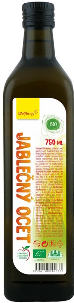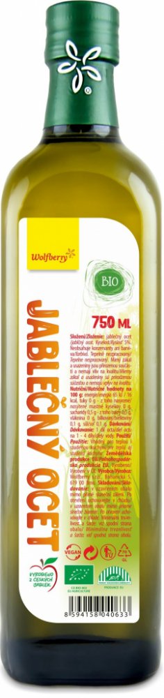 BIO jablečný ocet je přírodní produkt, který byl vyrobený fermentací alkoholu z čerstvě vymačkaného organického jablečného džusu a kyseliny octové. Tím si zachoval přírodní vitaminy a minerály z ovoce. Obsahuje vitaminy C, E, B6, pektin, betakaroten, minerály a antioxidanty, které detoxikují tělo, pomáhají regulovat hladinu cholesterolu, urychlují rozklad tuků, napomáhají snižovat hladinu cukru v krvi a minimalizují riziko srdečního infarktu. BIO jablečný ocet může být zakalený přirozeně se vyskytujícím pektinem. Mírný zákal a usazeniny jsou jeho přirozenou součástí a nemají vliv na jeho kvalitu. Není tepelně zpracovaný a neobsahuje žádná umělá barviva ani konzervační látky. Jablečný ocet se též řadí mezi přírodní léčiva s výbornými účinky na celé naše tělo.Nutriční hodnoty v 100 g: Energetická hodnota: 65 kJ / 16 kcal; Tuky: 0 g - z toho nasycené mastné kyseliny 0 g; Sacharidy: 0,5 g - z toho cukry 0,5 g; Vláknina 0 g, Bílkoviny: 0,1 g; Sůl: 0,1 g