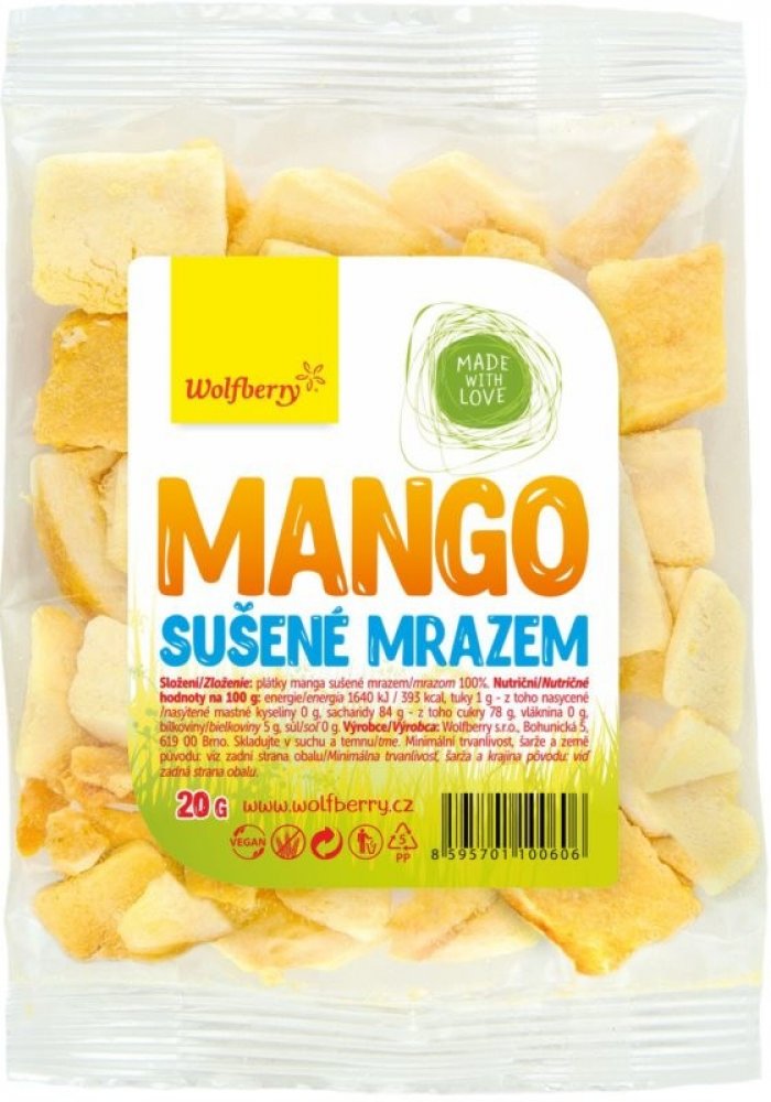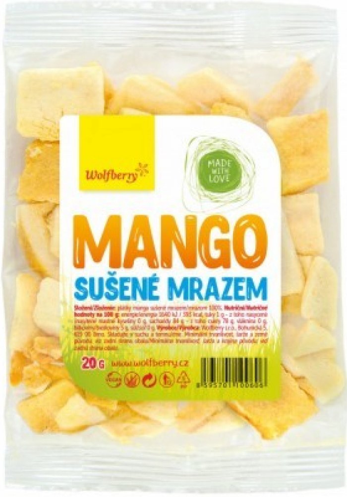 Mango je bohatým zdrojem betakarotenu, vitamínu C a vitaminu A. Jedinečný postup zpracování lyofilizací zachovává ovoci jeho plnohodnotnou chuť, barvu i aroma. Sušené ovoce tím nepřichází o své vitamíny, minerály a další živiny obsažené v čerstvém ovoci. Lyofilizace je proces vysušení a odstranění vody ze suroviny za extrémně nízké teploty a tlaku. Výsledkem je surovina, která je vzhledově velmi podobná té čerstvé, avšak má mnohem nižší hmotnost a dokonale křupavou konzistenci. Z nutričního hlediska je mango zajímavé vysokým obsahem draslíku, vitamínu E a některými vitamíny skupiny B, konkrétně B1, B2, B6 a niacin. Mrazem sušené ovoce je snadno skladovatelné, trvanlivé a lze jej částečně rehydratovat pomocí vody do téměř původního stavu. Pokud si u sušeného manga všimnete bílých skvrnek, nic se neděje. Jde o to, že ovoce často zcukernatí a to se projeví právě takto.