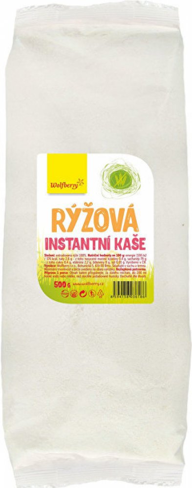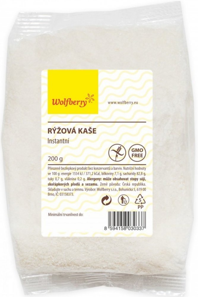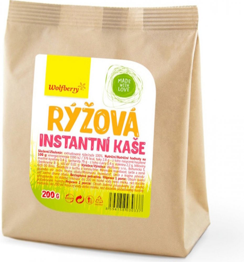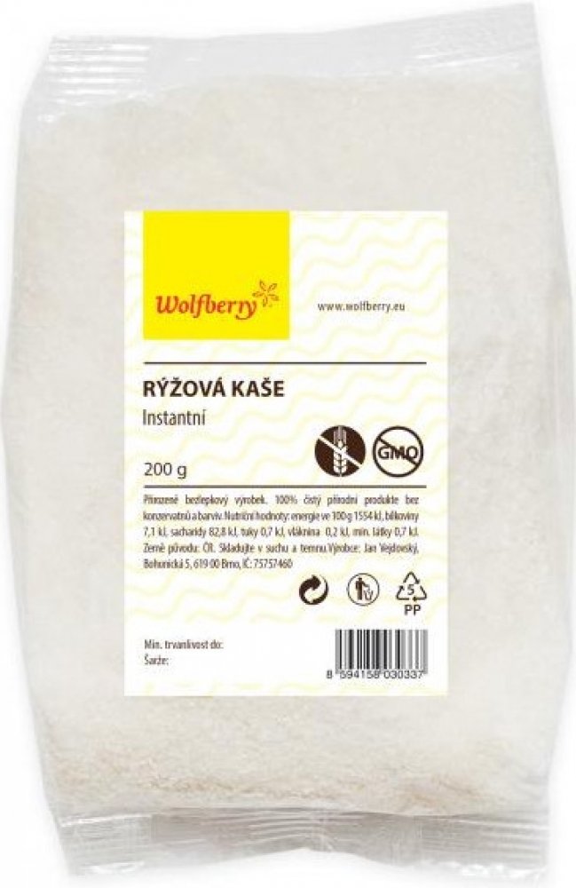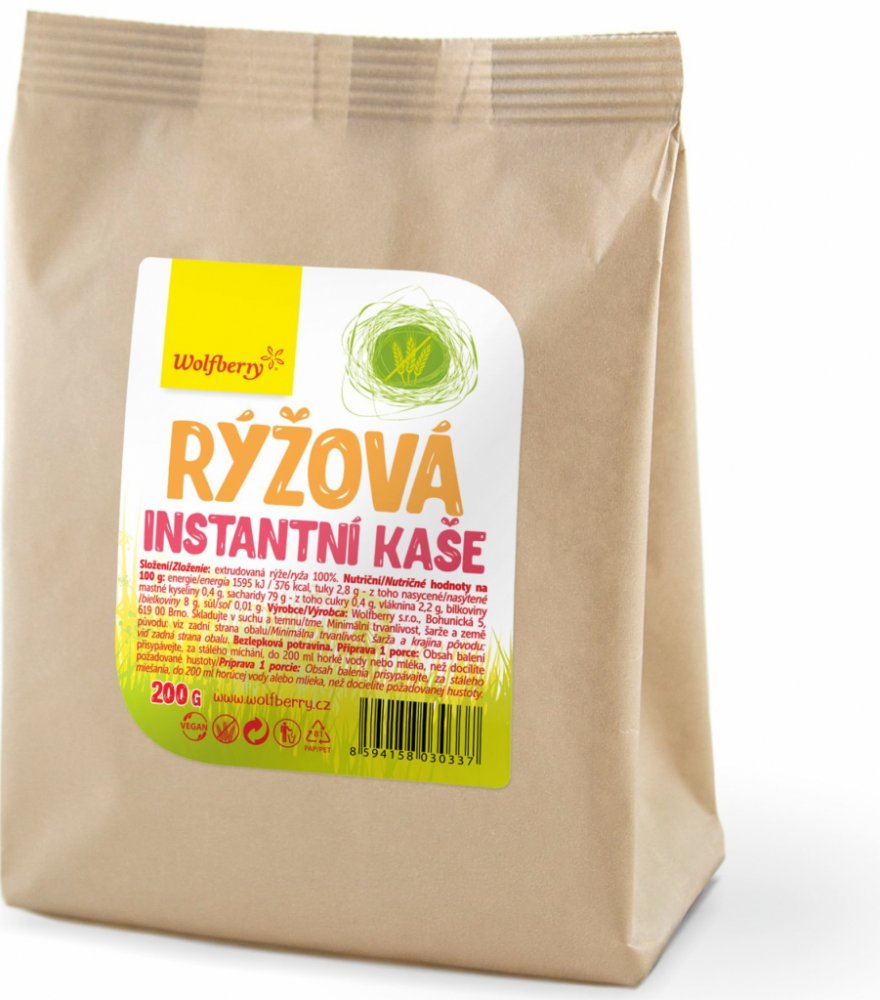 Rýžová kaše 200g Wolfberry. Instantní neochucená rýžová kaše, lehce stravitelná, rychle a snadno připravená, vyrobena z přirozeně bezlepkových surovin.
