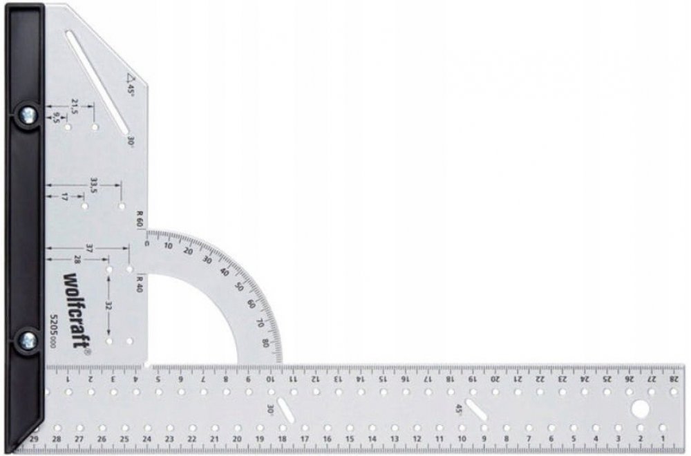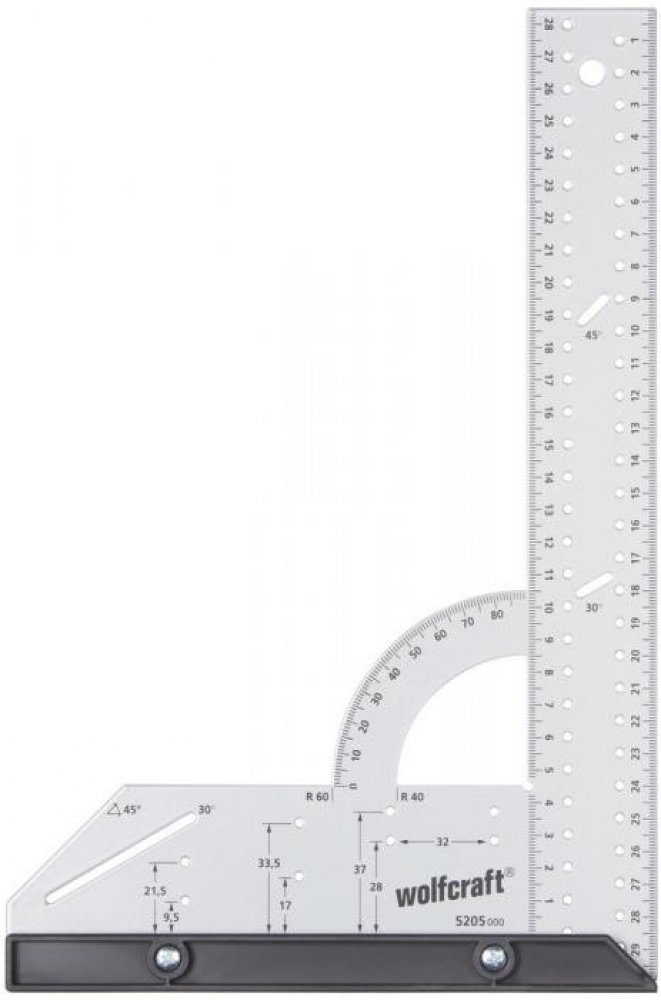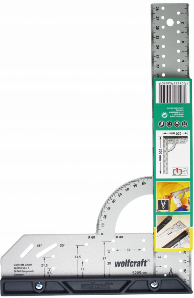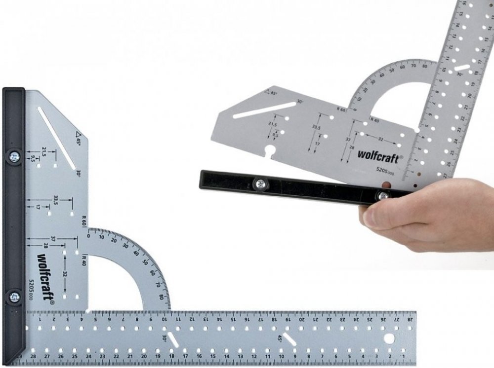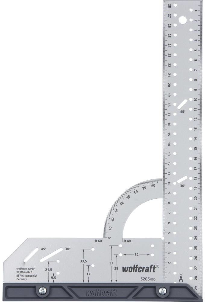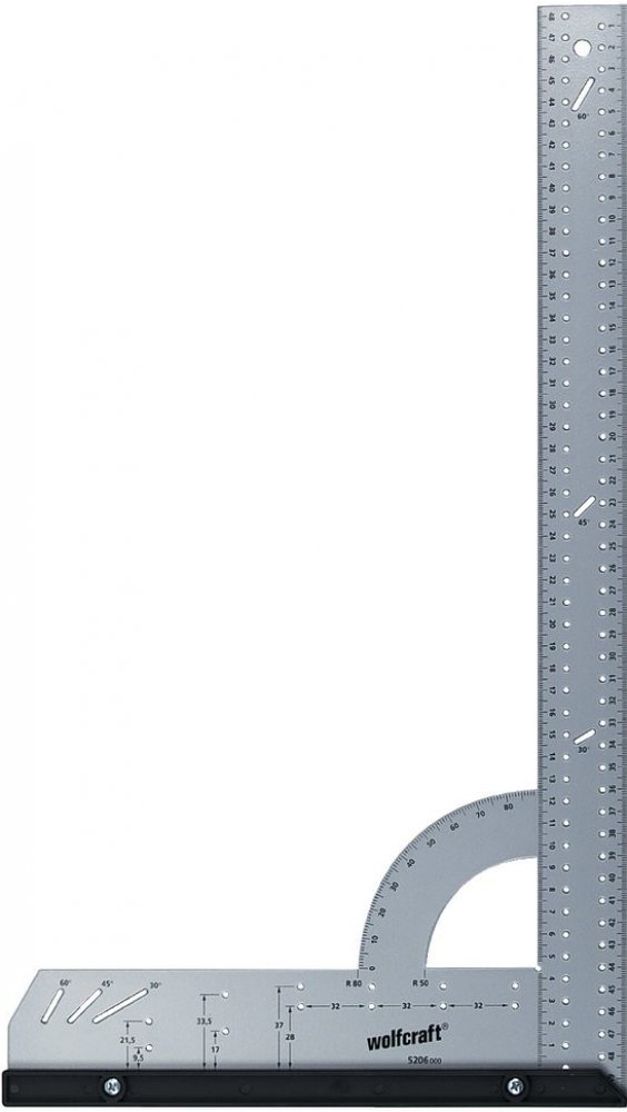 Univerzální měřicí a vyznačovací pomůcka z oceli kombinuje spoustu funkcí do jednoho nástroje. Pomocí univerzálního úhelníku zjistíte vzdálenosti a úhly a spolehlivě je přenesete na materiál. S využitím pevné zarážky a řady otvorů bezpracně tužkou zhotovíte rovnoběžné čáry. Zarážku na úhlové liště lze rychle odmontovat za účelem rýsování nebo měření na plochách. K přenesení oblých a kruhových tvarů na obrobek lze univerzální úhelník použít jako kružítko. Pomocí dvou pevných poloměrů na úhelníkové stupnici lze rychle přenést oblé tvary, například u zakulacených hran desek. Při práci s děrovací pilou poslouží úhelník jako stabilní náběhová hrana a své nezastupitelné místo si rychle najde také při pokládce laminátu nebo výrobě nábytku. Díky integrované 45° zarážce, řadě 32 otvorů nebo vrtací šabloně pro miskové závěsy je univerzální úhelník vhodný pro všechny projekty.
