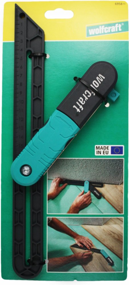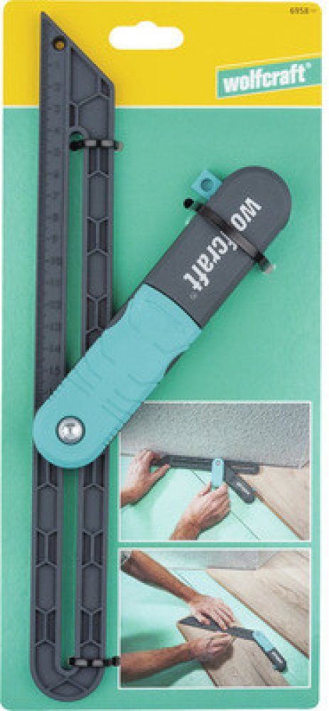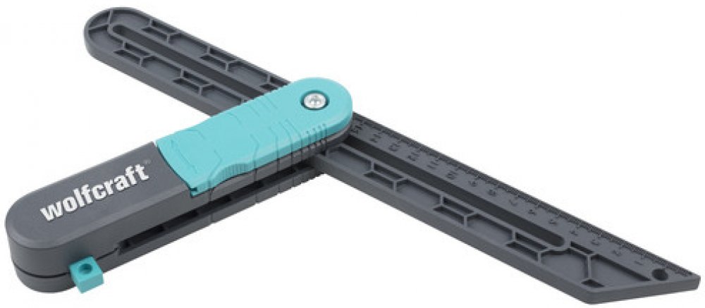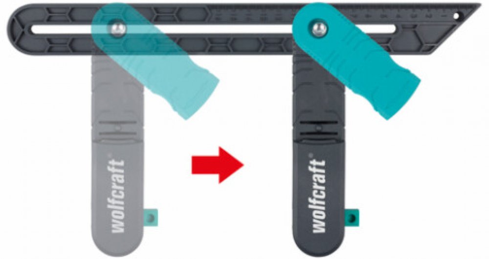 Pomůcka na měření úhlů pro pokládku. Prvním krokem je zasunutí dvou plastových noh do rohu stěny a jejich zarovnání podél stěn. K zajištění této polohy použijte zajišťovací páku. Je navržen tak, aby jej bylo možné snadno ovládat z obou stran pouze jednou rukou, a to i v úzkých pracovních oblastech. V dalším kroku umístíte úhel zkosení na obrobek a zaznamenáte úhel. Úhel zkosení je také vhodný pro označení rovnoběžných čar. Měřítko na pohyblivé noze a vodicí otvor pro tužku Vám usnadní práci. Jednoduše umístěte doraz, vložte kolík a veďte úhel zkosení přes obrobek.
