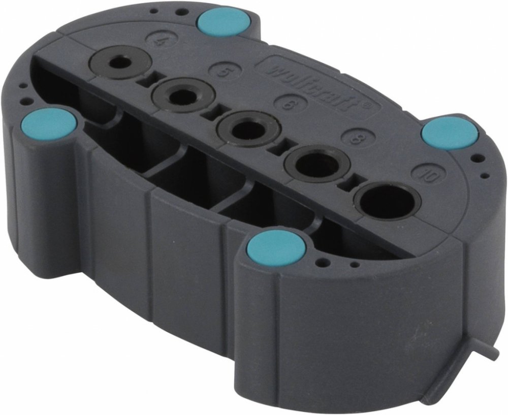 Žádný prokluz vrtáku na hladkých plochách díky gumovému nárazníku. Polohovací čáry pro přesné vrtání. Integrovaná V – drážka k bezpečnému upnutí kruhových materiálů. 5 přesných vrtacích pouzder z kovu pro vrtáky o průměru 4, 5, 6, 8 a 10mm.