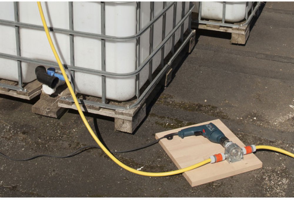 Připojte hřídel k vrtačce a připojte zahradní hadice k příslušným spojům.
