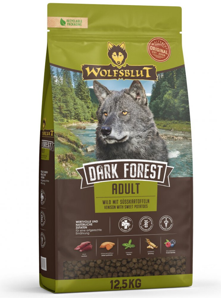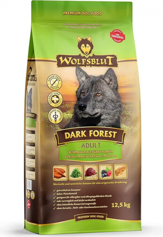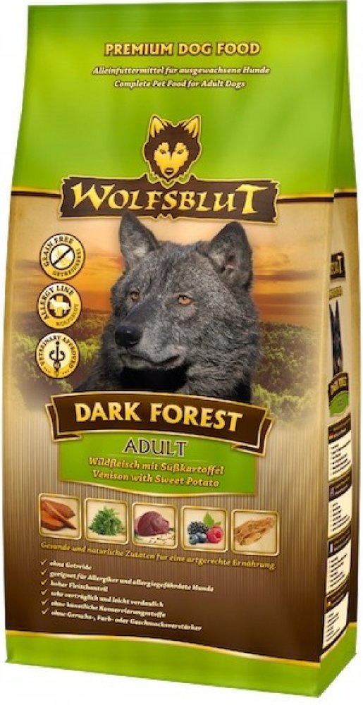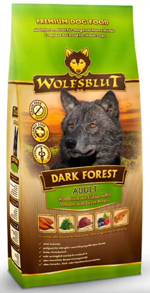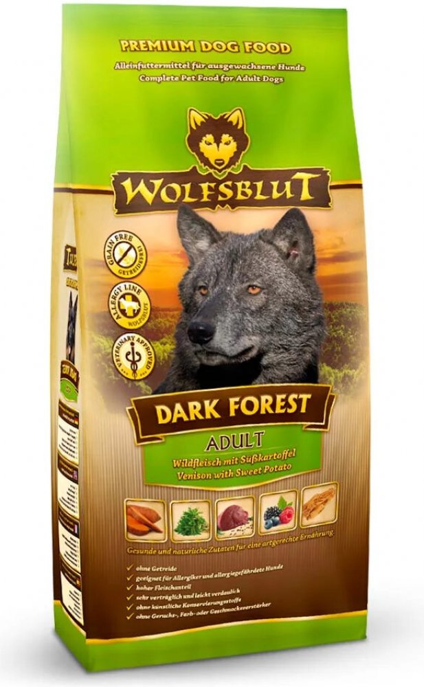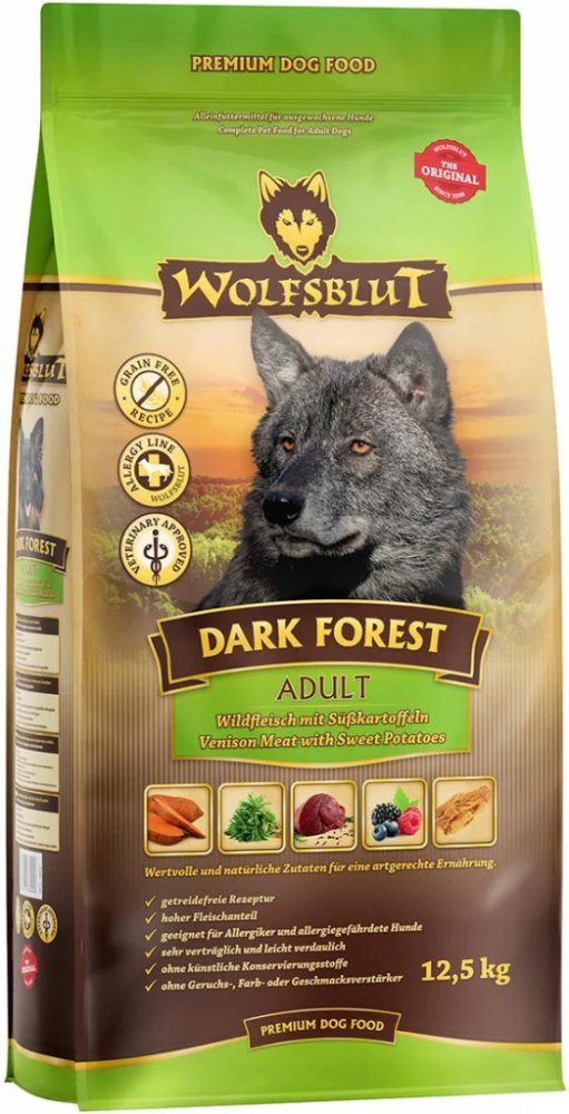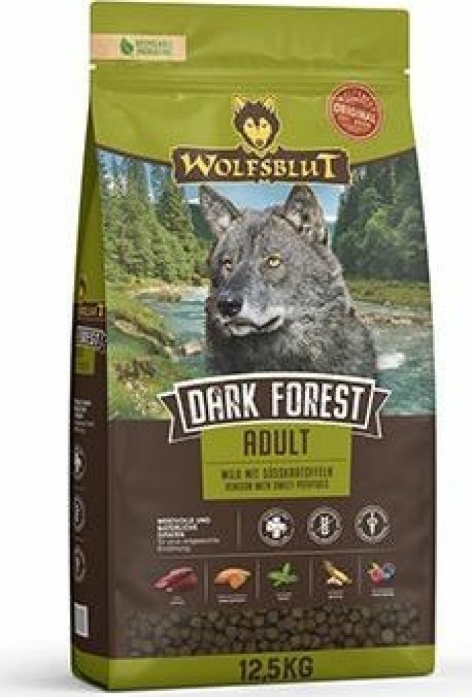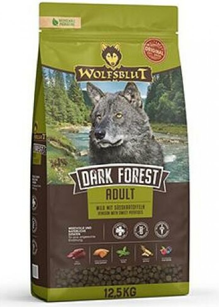 Wolfsblut Dark Forest Adult 12,5kg - zvěřina s batáty je kompletní granulované krmivo pro dospělého psa s čerstvým srnčím, zvěřinou, sladkými bramborami a Arónií.