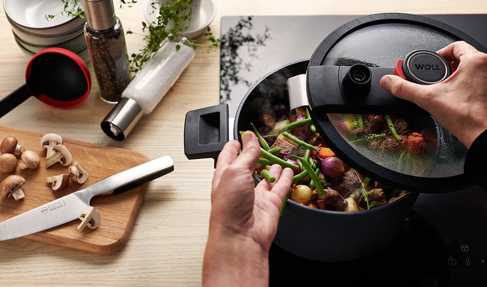 Revoluce při vaření za mírně zvýšeného tlaku, tak by se dal popsat polotlakový hrnec, který kombinuje unikátní nepřilnavou technologie povrchů Woll s patentovanou poklicí, jež je přizpůsobena vaření při mírně zvýšeném tlaku. Bod varu u tohoto modelu kastrolu přichází podstatně dříve, takže při vaření nepřicházíte o chuť pokrmu ani o důležité vitamíny v něm obsažené. Při přípravě jídla navíc uspoříte čas a energii.