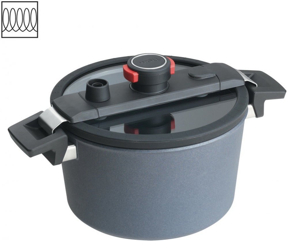 Revoluce při vaření, kdy se vaří za mírně zvýšeného tlaku. To je polo-tlakový hrnec, který kombinuje nepřilnavou, unikátní technologie povrchů s patentovanou poklicí Woll, která je uzpůsobená pro vaření při mírně zvýšeném tlaku.