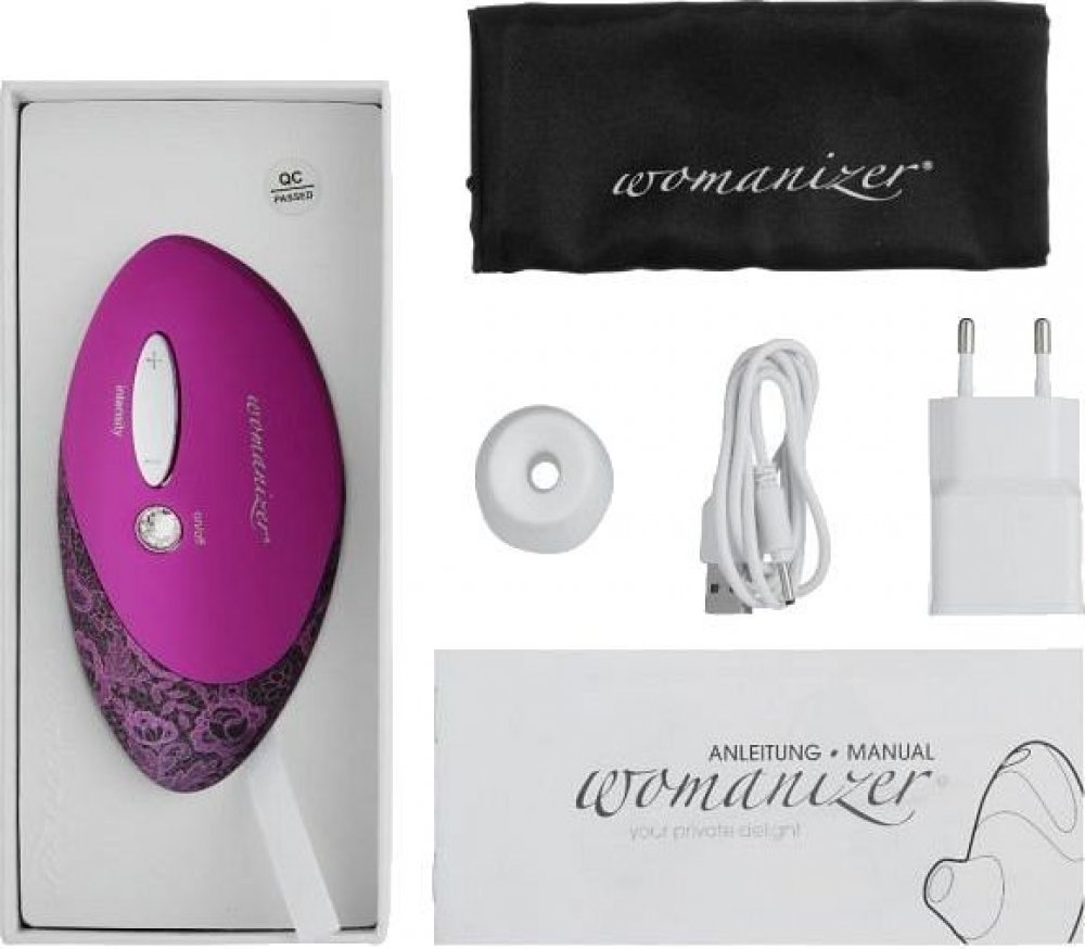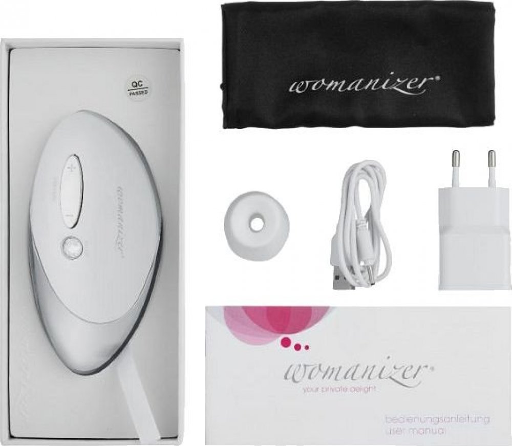 Masážní strojek Womanizer zlehka nasaje klitoris a pak jej s pomocí pulzujících tlakových vln bezdotykově a jemně stimuluje. S Womanizerem nehrozí podráždění klitorisu ani žádné nepříjemné bolesti. Zažijete tak zcela nové pocity slasti, které jsou korunovány orgasmy. V balení jsou dva stimulační nástavce, jeden standardní ve velikosti cca 14 x 12 mm a jeden XL ve velikosti cca 20 x 19 mm. Nástavce jsou odnímatelné a snadno omyvatelné. Womanizer se jednoduše nabíjí pomocí USB kabelu po úplnem vybití po dobu 120 minut, délka provozu je 240 minut. Womanizer není kvůli způsobu, jakým funguje vodotěsný, ale pouze voděodolný.