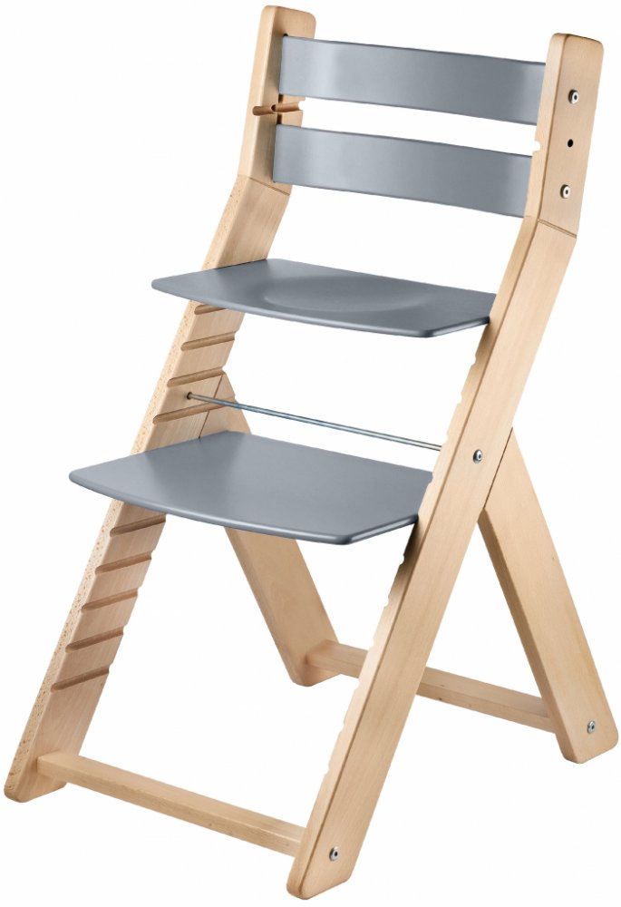 Židle dále disponuje tvarovanými zádovými opěrkami, které efektivně podporují páteř a minimalizují riziko vývoje bolestí zad a skoliózy páteře. Výškově nastavitelná podnožka z bukové překližky umožňuje snadné nastavení do výšky 40, 36, 32, 28, 24, 20, 16 a 12 cm od podlahy. Je velice důležité, aby byl sedák a podnožka správně, výškově, nastaveny tak, aby nedocházelo k zaškrcení proudění krve v kolenních jamkách dítěte.