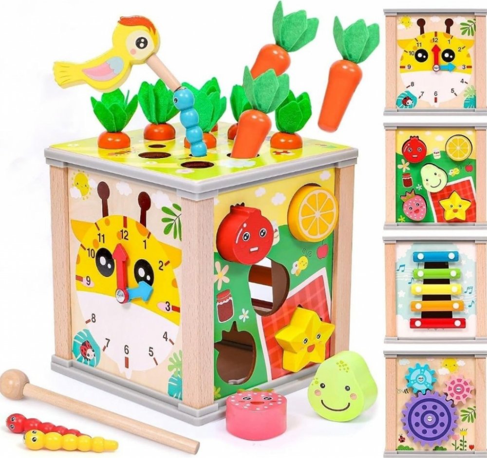 Tato kostka nabízí 6 her- sklízení mrkve, chytání červů ( magnet ), hra na xylofon, rotující ozubená kola, učení hodin, vkládání tvarů