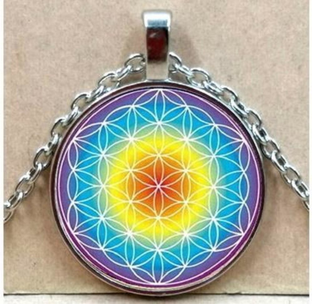 Přívěsek Květ života rozměry přívěsku: výška včetně očka: 3,6 cm / průměr 2,8 cm délka řetízku: 50 cm materiál: zinková slitina s povrchovou úpravou SILVER , tvrzené sklo