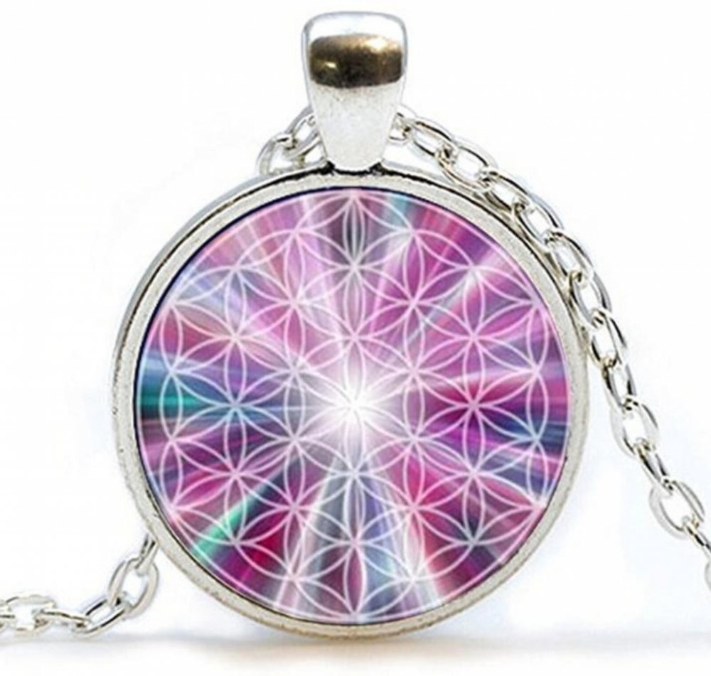 Přívěsek Květ života rozměry přívěsku: výška včetně očka: 3,6 cm / průměr 2,8 cm délka řetízku: 50 cm materiál: zinková slitina s povrchovou úpravou SILVER , tvrzené sklo