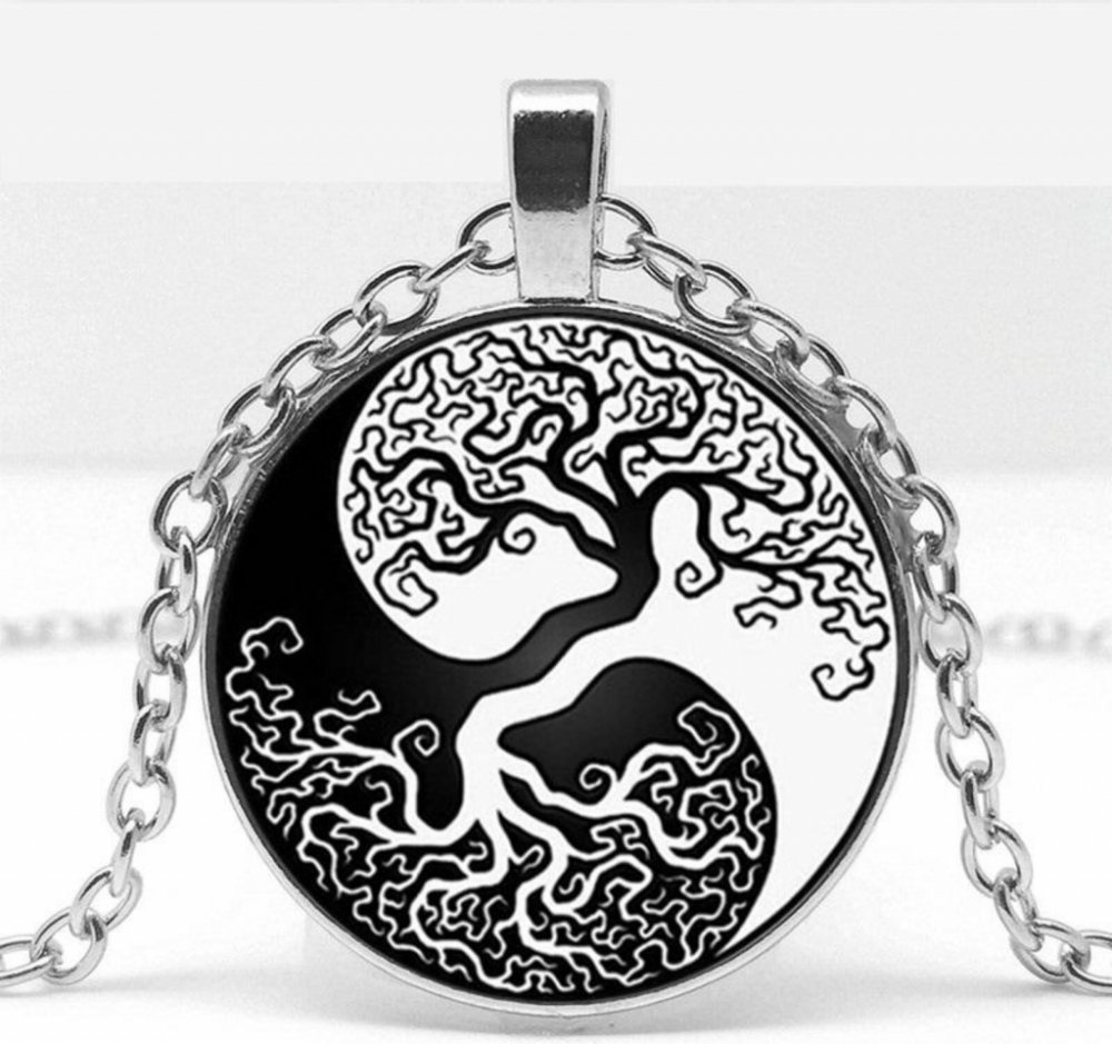 Přívěsek Jin Jang Strom života rozměry přívěsku: výška včetně očka: 3,6 cm / průměr 2,8 cm délka řetízku: 50 cm materiál: zinková slitina s povrchovou úpravou SILVER , tvrzené sklo