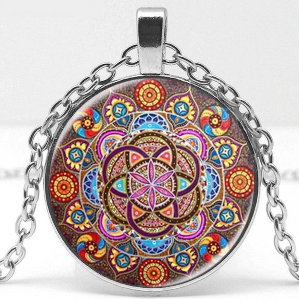 Přívěsek Mandala - Květ života rozměry přívěsku: výška včetně očka: 3,6 cm / průměr 2,8 cm délka řetízku: 50 cm materiál: zinková slitina s povrchovou úpravou SILVER , tvrzené sklo