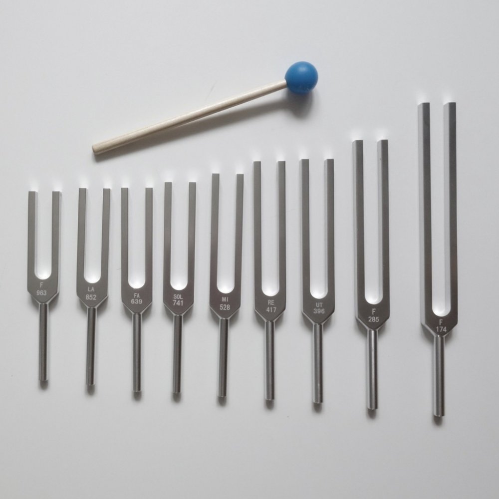 Sada ladiček Solfeggio frekvence - Relaxační terapeutické ladičky (ladící vidličky) - meditační 9 kusů - frekvence od 174 Hz do 963 Hz Sada obsahuje celkem 9 kusů ladiček 6 základních frekvencí: 1) ladičku / frekvence 396 Hz * Kořenová čakra 2) ladičku / frekvence 417 Hz * Sakrální čakra 3) ladičku / frekvence 528 Hz * Solar plexus čakra 4) ladičku / frekvence 639 Hz * Srdeční čakra 5) ladičku / frekvence 741 Hz * Krční čakra 6) ladičku / frekvence 852 Hz * Třetí oko čakra / čelo + 3 další frekvence: 7) ladičku / frekvence 174 Hz 8) ladičku / frekvence 285 Hz 9) ladičku / frekvence 963 Hz * Korunní čakra + ZDARMA praktické pouzdro a palička Použití: meditace, relaxace, harmonizace materiál: hliník